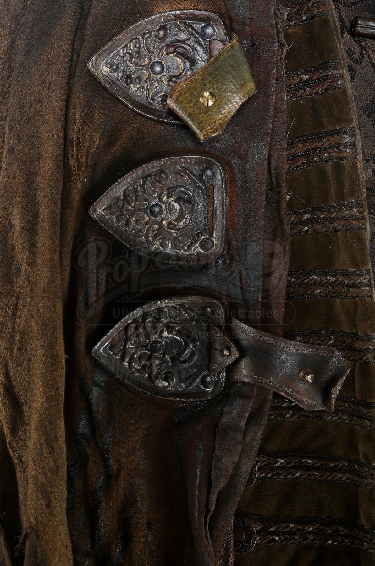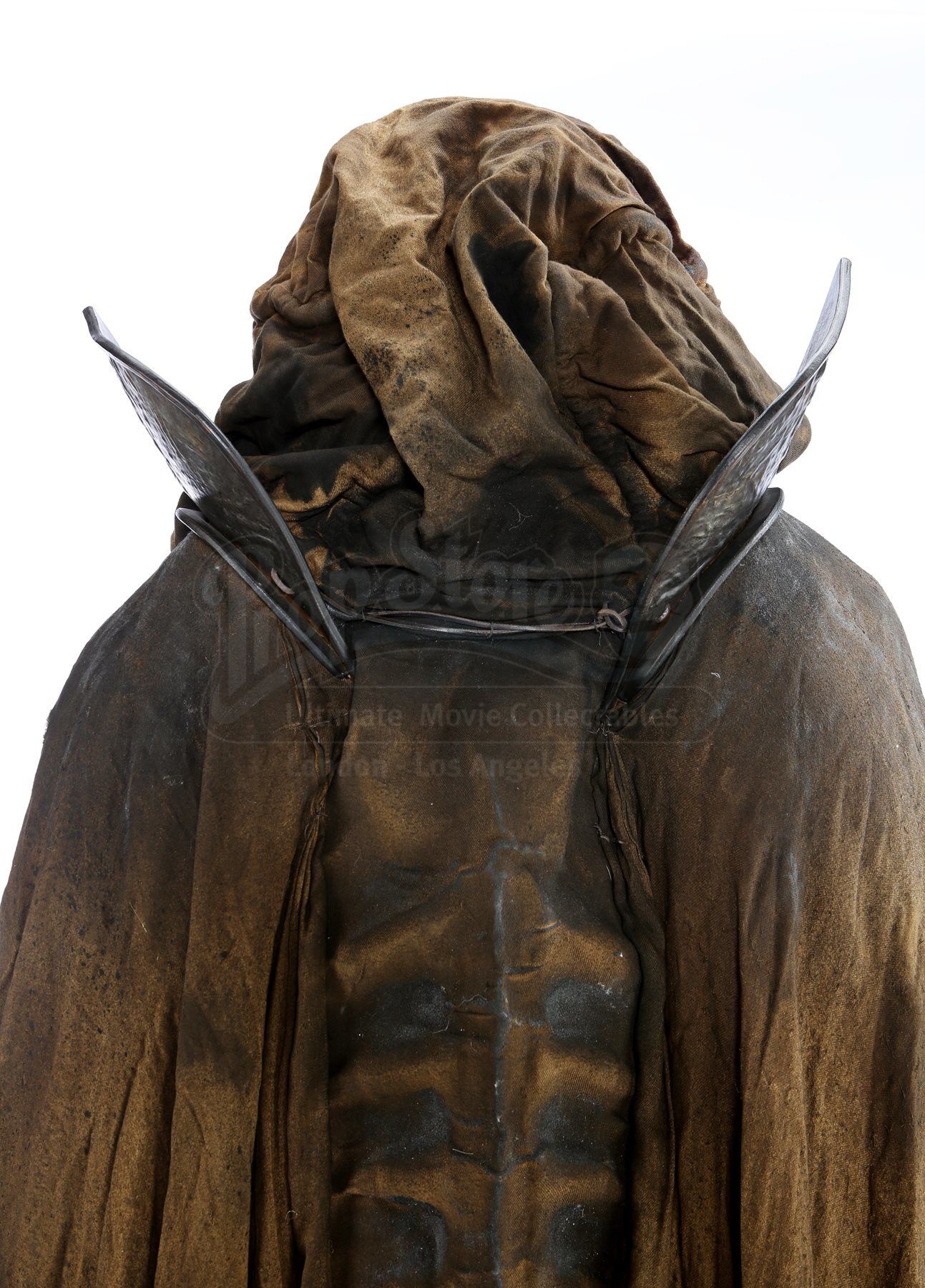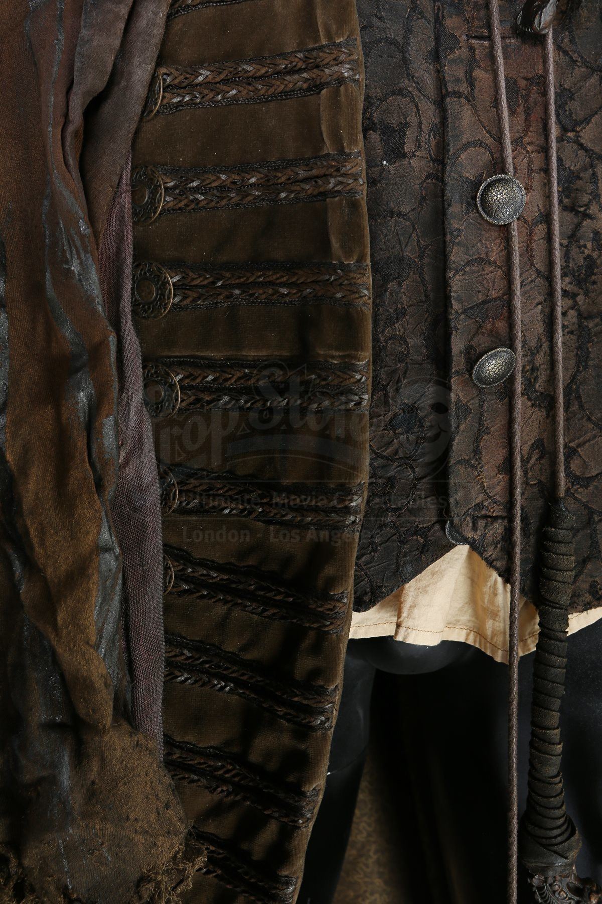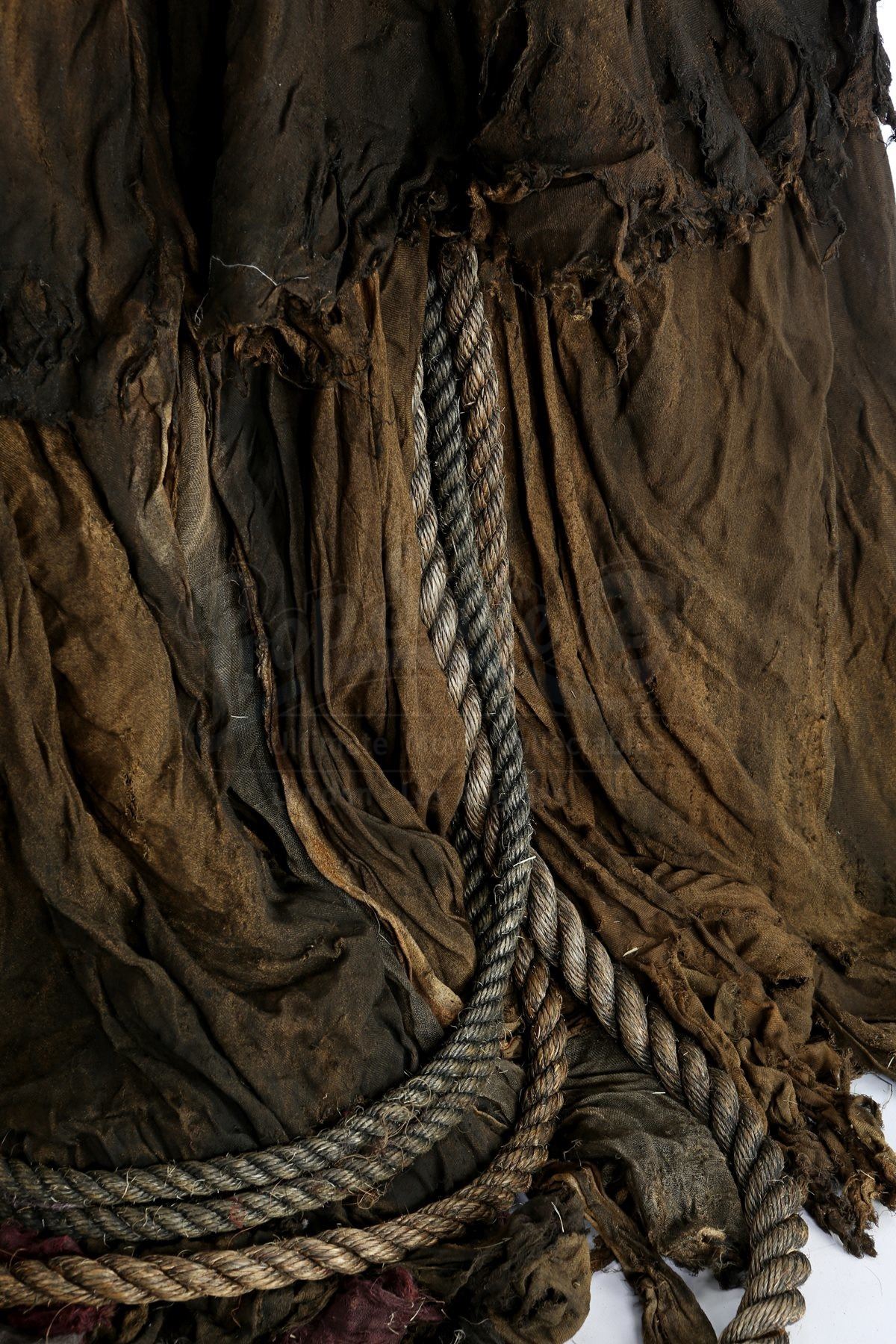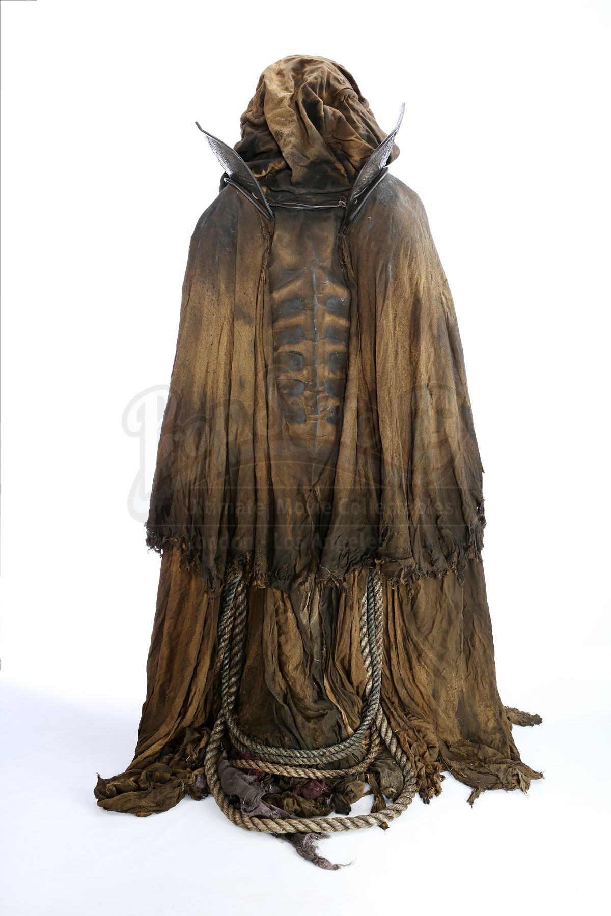 This imposing costume was designed by Academy Award®-winning costume designer Luis Sequeira, and consists of a large cloak, an undercoat, a vest, a tunic and a pair of boots. The large cloak is made of hand-dyed and shredded fabrics that are designed to make it look tattered and worn, with thick ropes also hanging from it. The necklace is produced from resin pieces cast in the shape of small pieces of bone, painted and coated in certain places with dried blood. Attached to the necklace is a tag marked, “Young Master”. A shirt, worn under the vest, and an ornate velvet undercoat complete the costume. Each boot is a size 11.5 (US) and is made from leather, and each garment is marked as being a stunt piece. The costume shows intentional signs of wear and is in very fine condition.