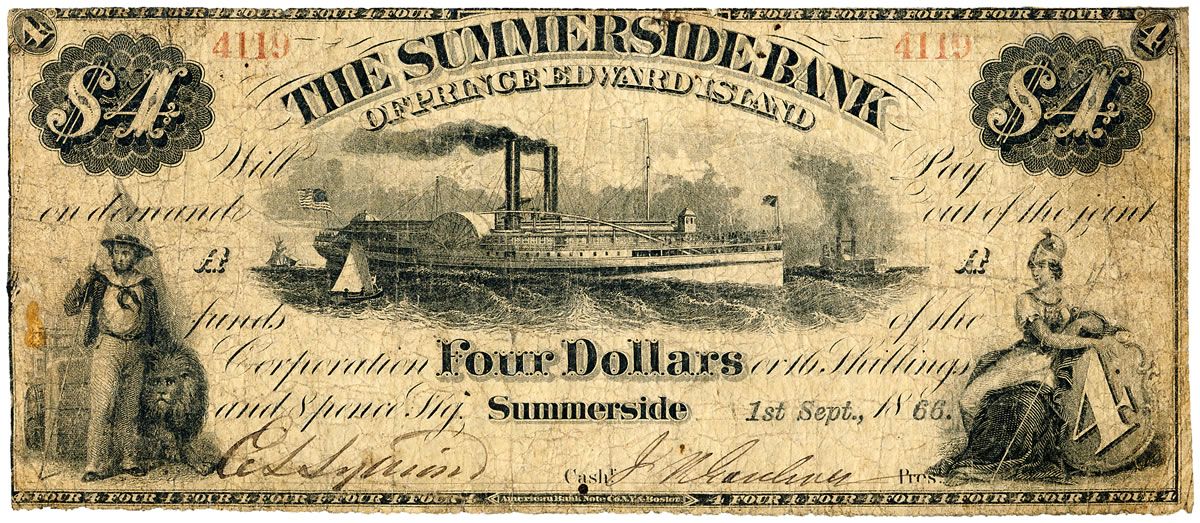 The Summerside Bank of Prince Edward Island was a short-lived but successful financial institution that operated on the island pre-confederation. In operation from 1866 to 1901, the Summerside Bank had to close its doors due to the financial hardship Prince Edward Island faced at the end of the 19th century; it was absorbed by the Bank of New Brunswick in 1901. The brief life of this once-prosperous bank is what makes the elusive Summerside Banknotes so desirable. It is reported that only $43 in face-value of these notes exists on the market today! This is a rare and exciting opportunity to own four different examples of Summerside currency; these banknotes will make an impressive addition to any distinguished collection of rare Canadian currency.