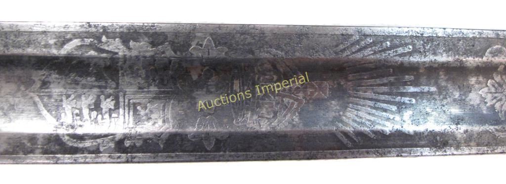 A British M1897 officer’s sword with the large, nickeled steel hilt pierced with VR cypher and applied gilt copper badge of the Royal Flying Corps (RFC crowned and supported by a laurel wreath.) With knurled backstrap and wooden grip covered with sharkskin, the grip wires intact. Original leather washer intact, the M1892 blade with central fuller, the left side elaborately etched with flowering vines containing the maker’s name, HILL, NORFOLK STREET, SHEFFIELD, the crowned cypher of George V, and ROYAL FLYING CORPS. The right side marked, PROVED within a six-pointed star, and bearing the British coat of arms, together with H.R. JUNOR. In its original field scabbard of wood, covered in leather with nickeled locket and frog intact. Beginning of the 20th century. Untouched, with minor wear, leather frog lacking part of one strap. Hugh R. Junor, DFC, X SQUADRON RFC, was commissioned from the ranks of the Royal Horse Artillery into the Royal Flying Corps. He was a member of X Squadron, the small group of planes that were assigned to assist T.E. Lawrence in the campaign against the Turks. Junor alone answered Lawrence’s call for air support at Deraa on September 17, 1918, throwing himself at eight enemy aircraft in an inferior machine and drawing them off. Though finally downed, Junor continued to fight, pulling the machineguns from his fighter and racing to the front, where blew up a section of the railroad singlehanded. He received the Distinguished Flying Cross for his actions. Hugh R. Junor held the rank of Flight Lieutenant upon his death as a test pilot in 1926. T.E. Lawrence described Junor’s valor in detail and also included a portrait of him in his renowned book, THE SEVEN PILLARS OF WISDOM (1926: London, Cape.) P. 596-597: “While we hesitated, things were marvellously solved. Junor, the pilot of the B.E. 12 machine, now alone at Azrak, had heard from the disabled Murphy of the enemy machines about Deraa, and in his own mind decided to take the Bristol Fighter’s place, and carry out the air programme. So when things were at their thickest with us he suddenly sailed into the circus. We watched with mixed feelings, for his hopelessly old-fashioned machine made him cold meat for any one of the enemy scouts or two-seaters: but at first he astonished them, as he rattled in with his two guns. They scattered for a careful look at this unexpected opponent. He flew westward across the line, and they went after in pursuit, with that amiable weakness of aircraft for a hostile machine, however important the ground target. We were left in perfect peace. Nuri caught at the lull to collect three hundred and fifty regulars, with two of Pisani’s guns; and hurried them over the saddle behind Tell Arar, on the first stage of their march to Mezerib. If the aeroplanes gave us a half-hour’s law, they would probably notice neither the lessened numbers by the mound, nor the scattered groups making along every slope and hollow across the stubble westward. This cultivated land had a quilt-work appearance from the air: also the ground was tall with maize stalks, and thistles grew saddle-high about it in great fields. We sent the peasantry after the soldiers, and half an hour later I was calling up my bodyguard that we might get to Mezerib before the others, when again we heard the drone of engines; and, to our astonishment, Junor reappeared, still alive, though attended on three sides by enemy machines, spitting bullets. He was twisting and slipping splendidly, firing back. Their very numbers hindered them but of course the affair could have only one ending. In the faint hope that he might get down intact we rushed towards the railway where was a strip of ground, not too boulder-strewn. Everyone helped to clear it at speed, while Junor was being driven lower. He threw us a message to say his petrol was finished. We worked feverishly for five minutes, and then put out a landing-signal. He dived at it, but as he did so the wind flawed and blew across at a sharp angle. The cleared strip was too little in any case. He took ground beautifully, but the wind puffed across once more. His under-carriage went, and the plane turned over in the rough. We rushed up to rescue, but Junor was out, with no more hurt than a cut on the chin. He took off his Lewis gun, and the Vickers, and the drums of tracer ammunition for them. We threw everything into Young’s Ford, and fled, as one of the Turkish two-seaters dived viciously and dropped a bomb by the wreck. Junor five minutes later was asking for another job. Joyce gave him a Ford for himself, and he ran boldly down the line till near Deraa, and blew a gap in the rails there, before the Turks saw him. They found such zeal excessive, and opened on him with their guns: but he rattled away again in his Ford, unhurt for the third time.” Overall length 98.5 cm.