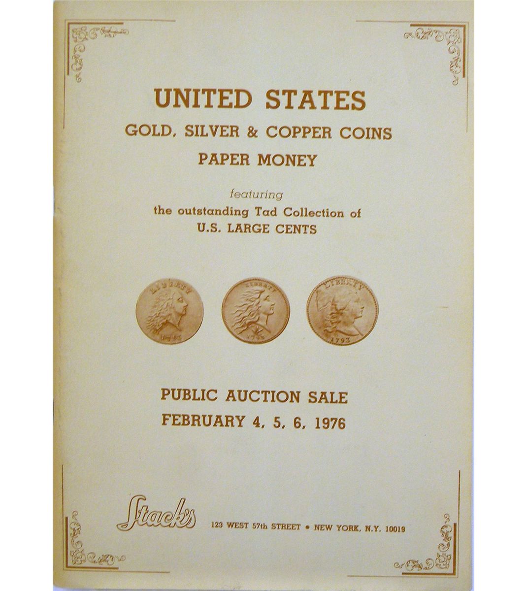 Stack’s. UNITED STATES GOLD, SILVER AND COPPER COINS, PAPER MONEY, FEATURING THE OUTSTANDING TAD COLLECTION OF U.S. LARGE CENTS. New York, Feb. 4–6, 1976. 8vo, original printed card covers. 127, (1) pages; 1471 lots. Fine. An important sale for the excellent large cents comprising the first 199 lots of the catalogue. Catalogued by C. Douglas Smith, though his grading was edited. The “Tad” collection belonged to Toby and Doris Syzmanski (née Nelson).