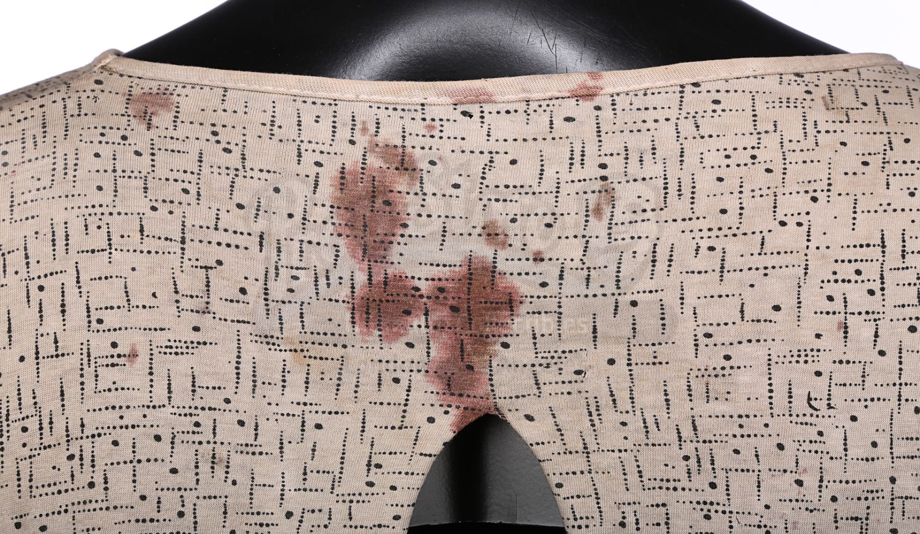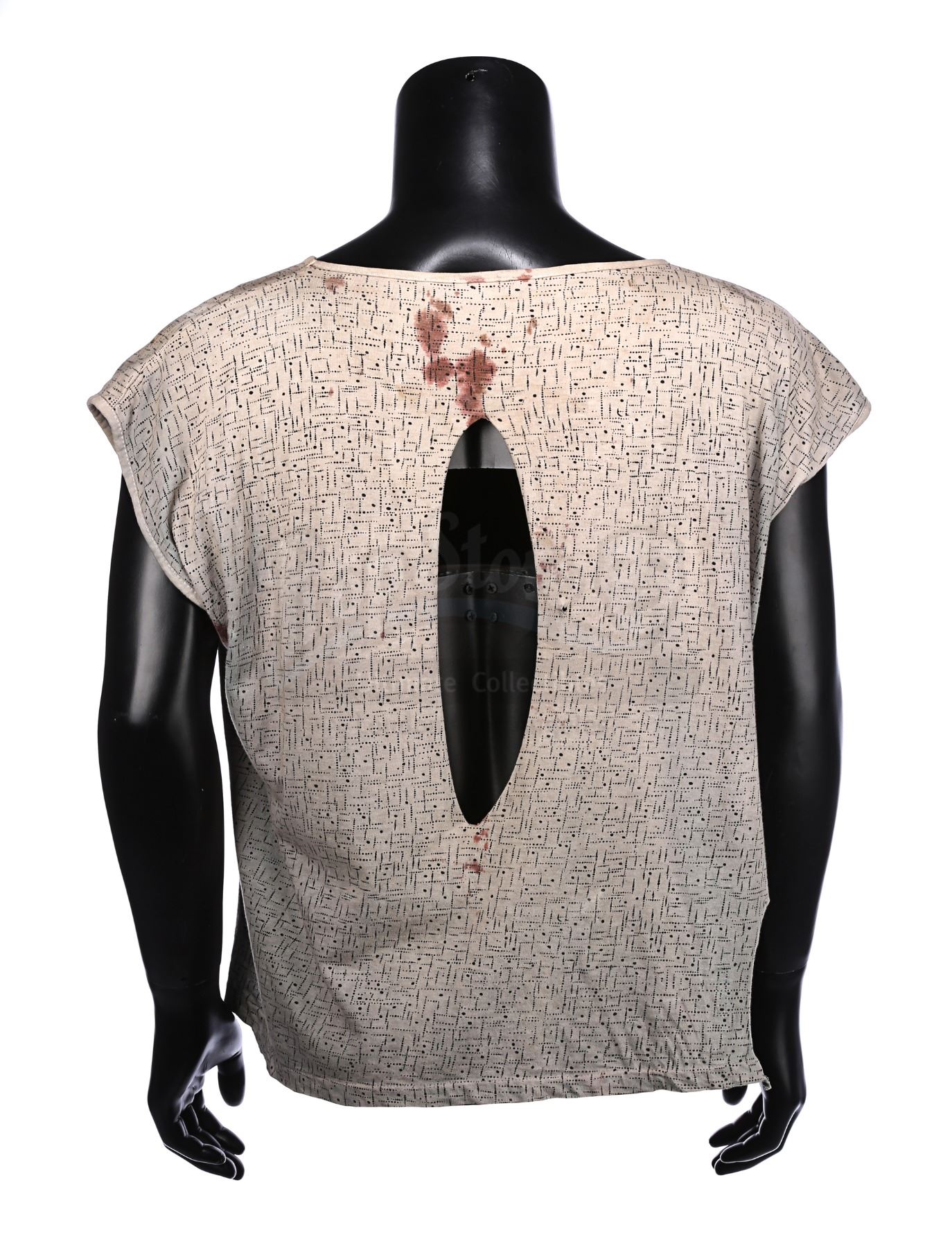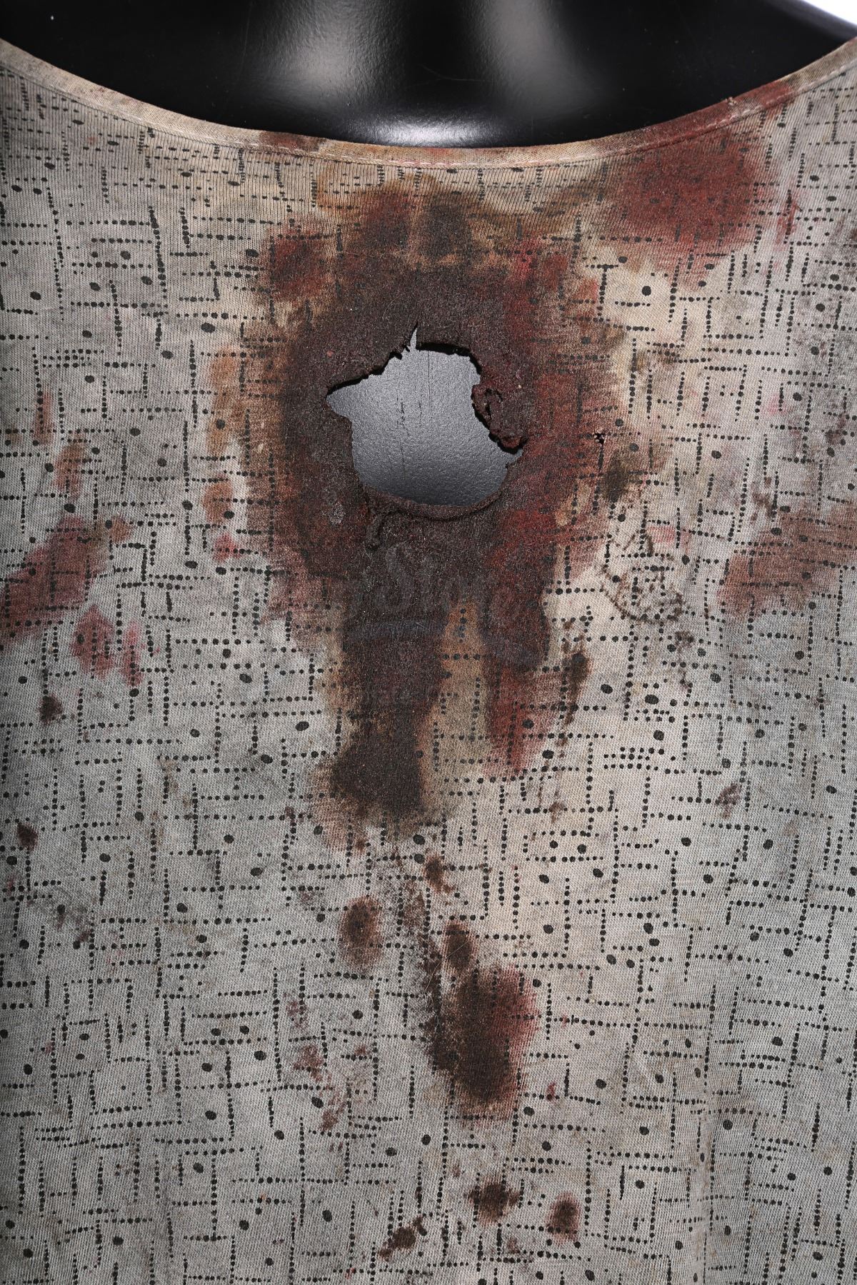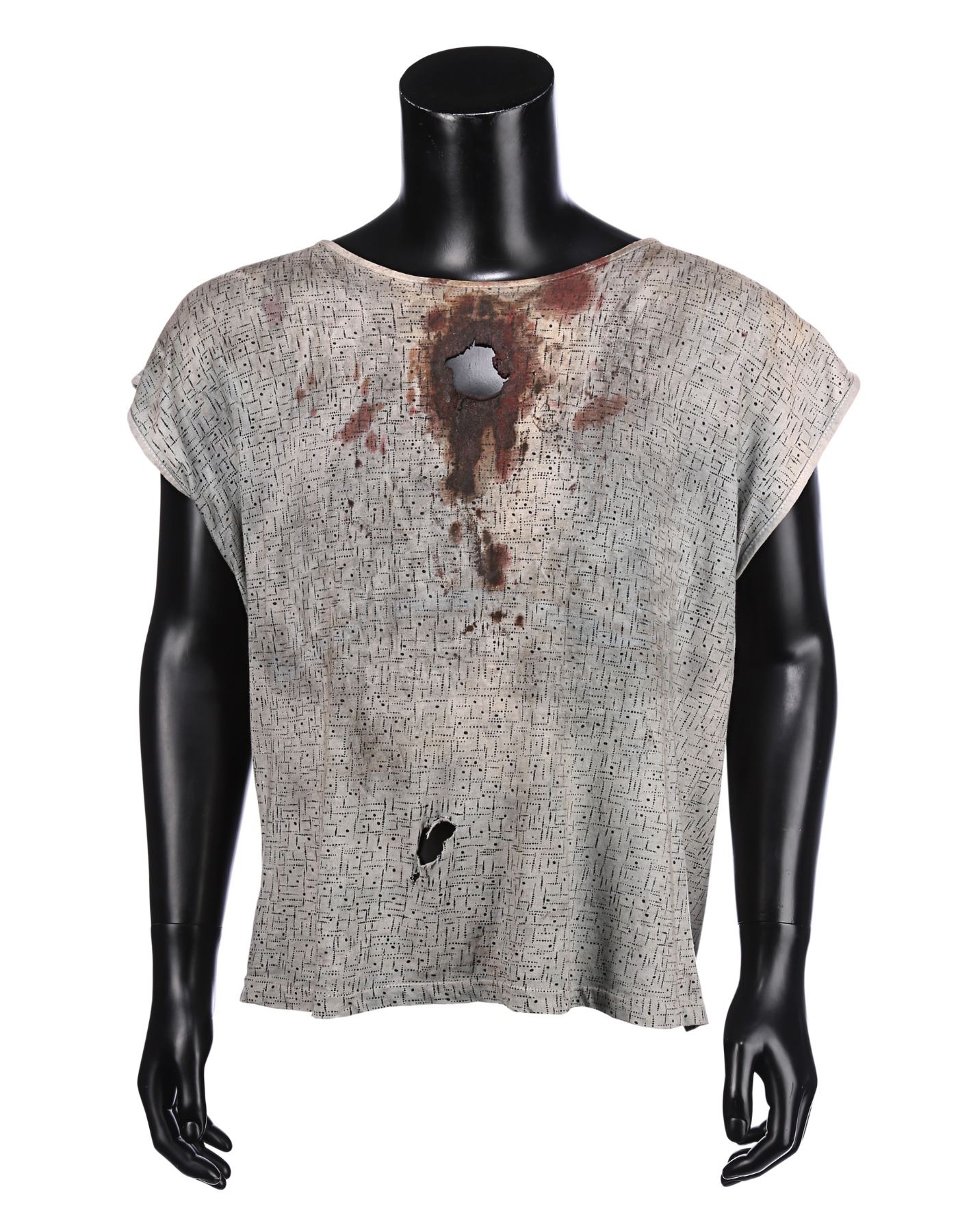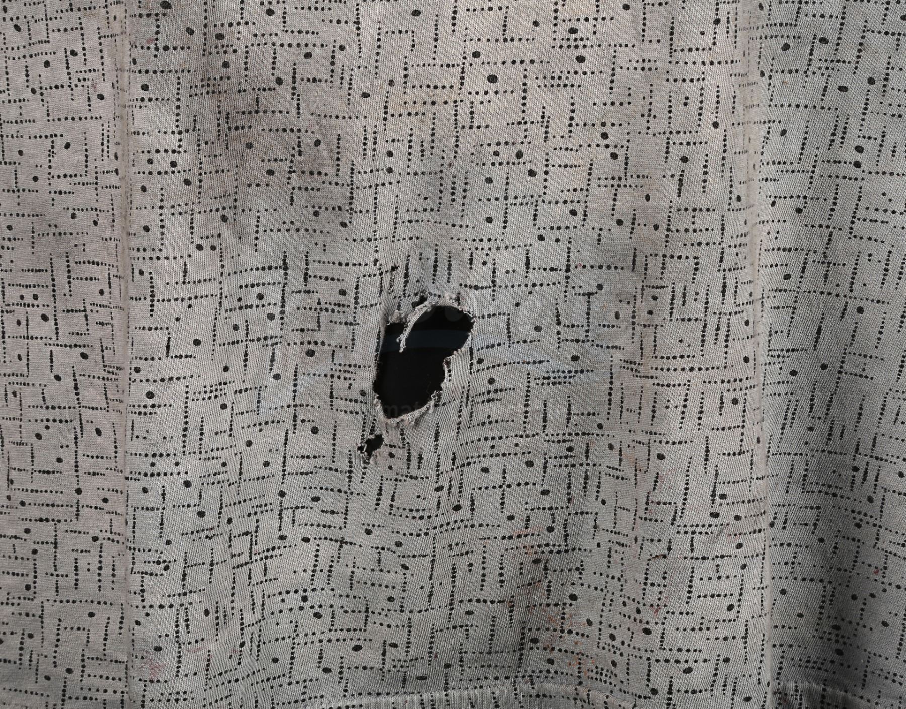 The grey cotton T-shirt displays a printed black-dotted pattern all over and has been heavily distressed for the production. Two prominent bullet holes adorn the front, with stage blood surrounding the top hole. The back and right side feature large slits, which suggest this garment may have been adapted for special effects purposes. The lot exhibits intentional wear, and the stage blood on the front has hardened over time.