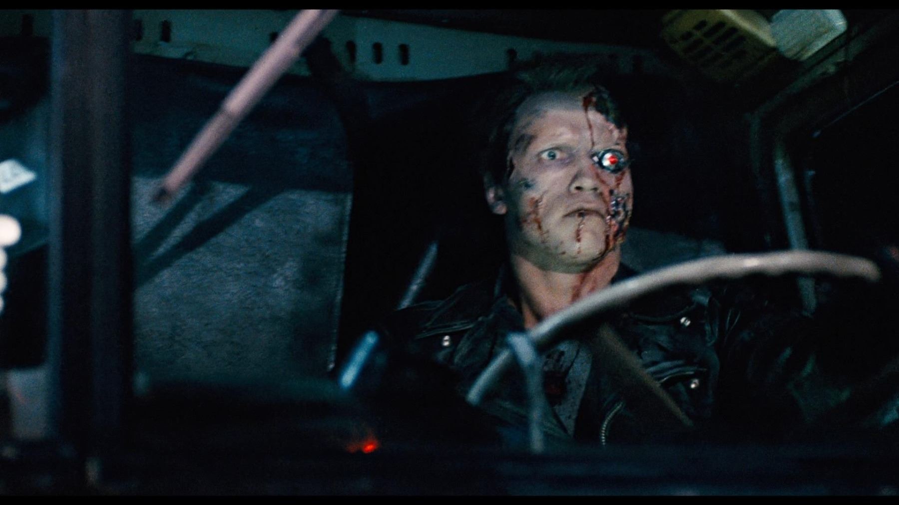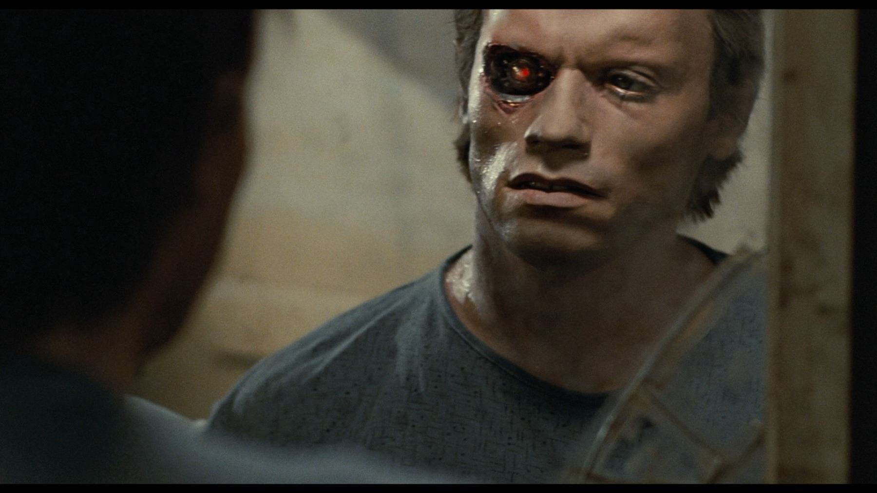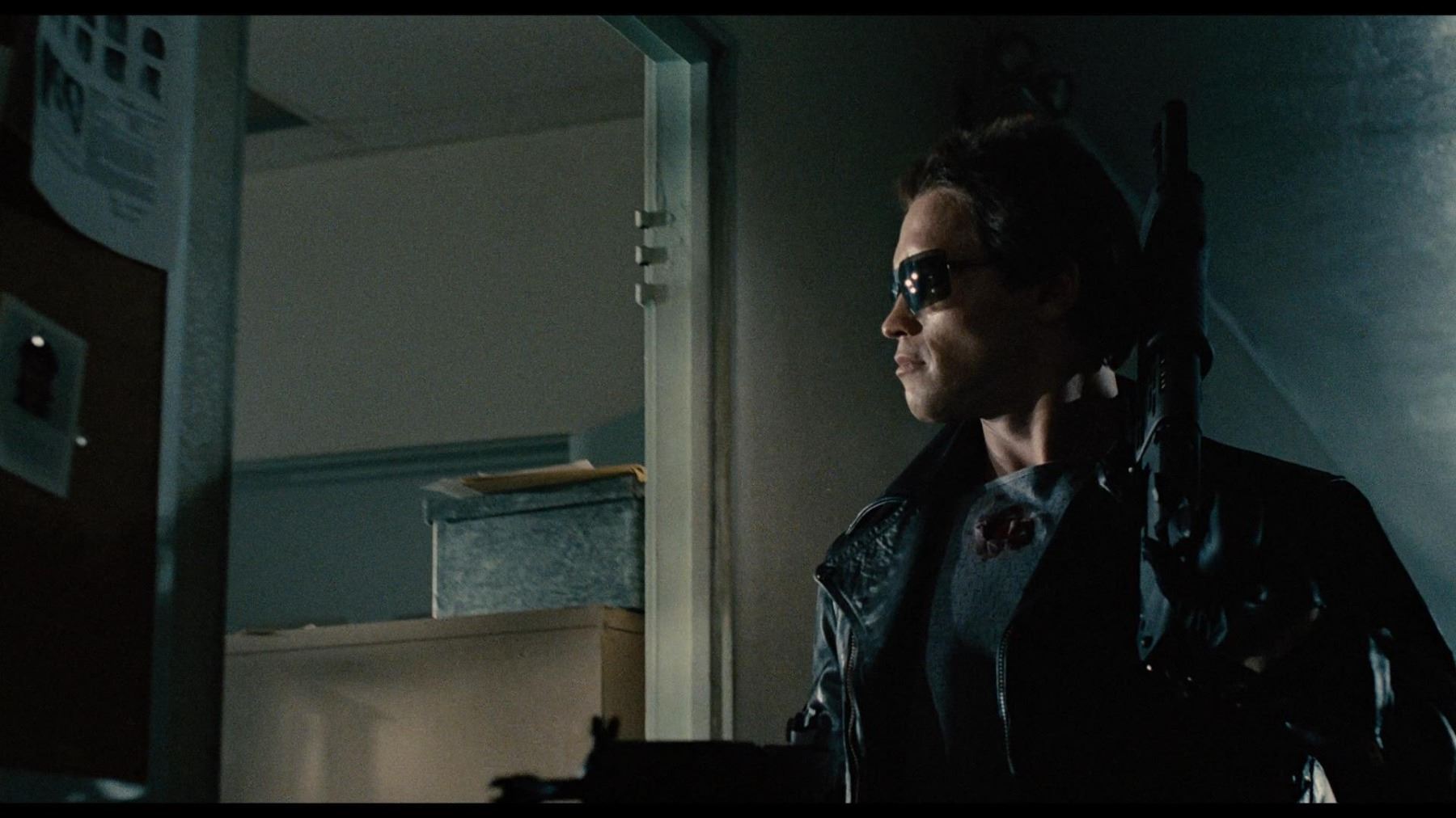 The Terminator's (Arnold Schwarzenegger) bloodied T-shirt from James Cameron's sci-fi action film The Terminator. The Terminator acquired a grey T-shirt and new outfit after repairing itself in a hotel room. The cyborg wore its signature outfit for the rest of the film, and the T-shirt became increasingly bloodied as the Terminator continued its pursuit of Sarah Conner (Linda Hamilton).