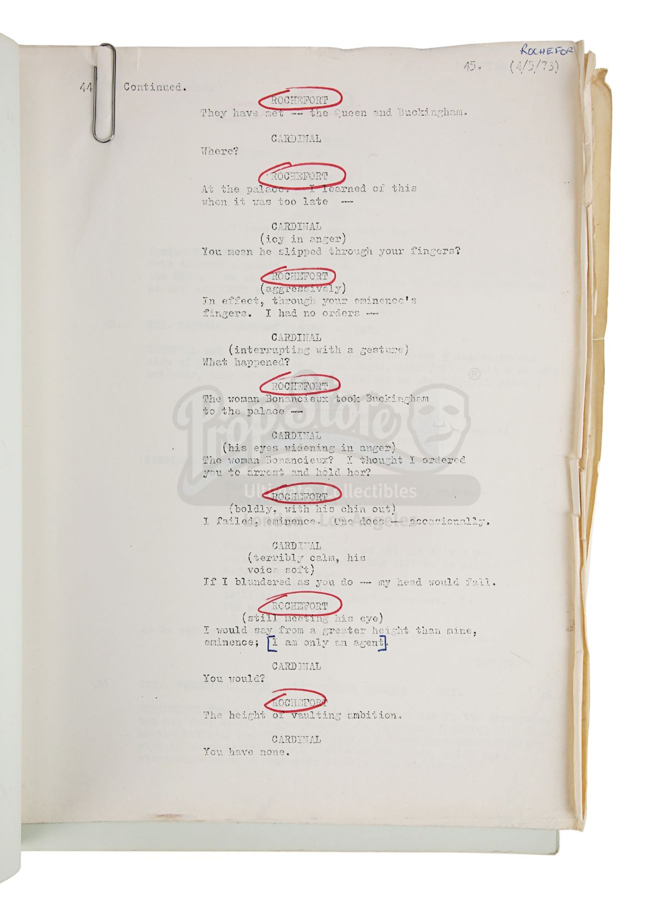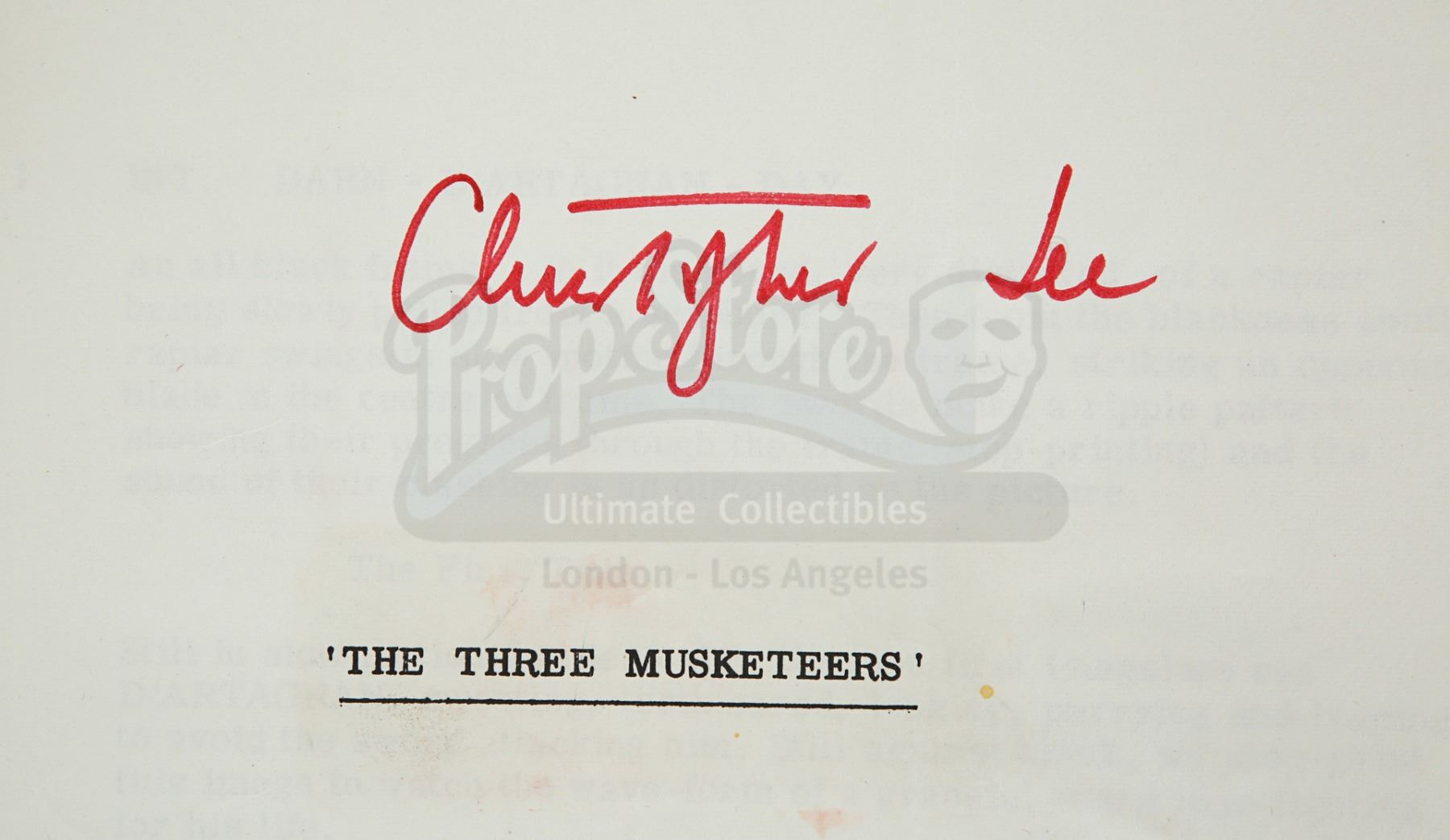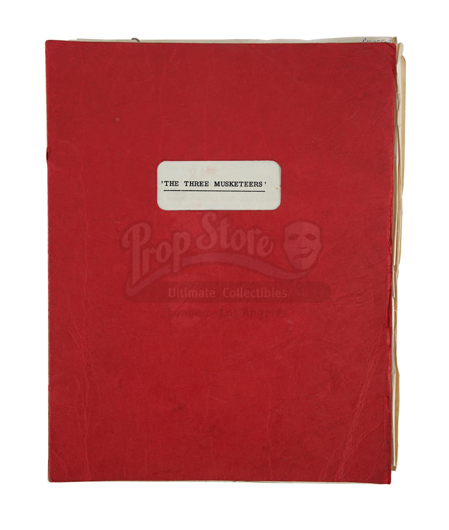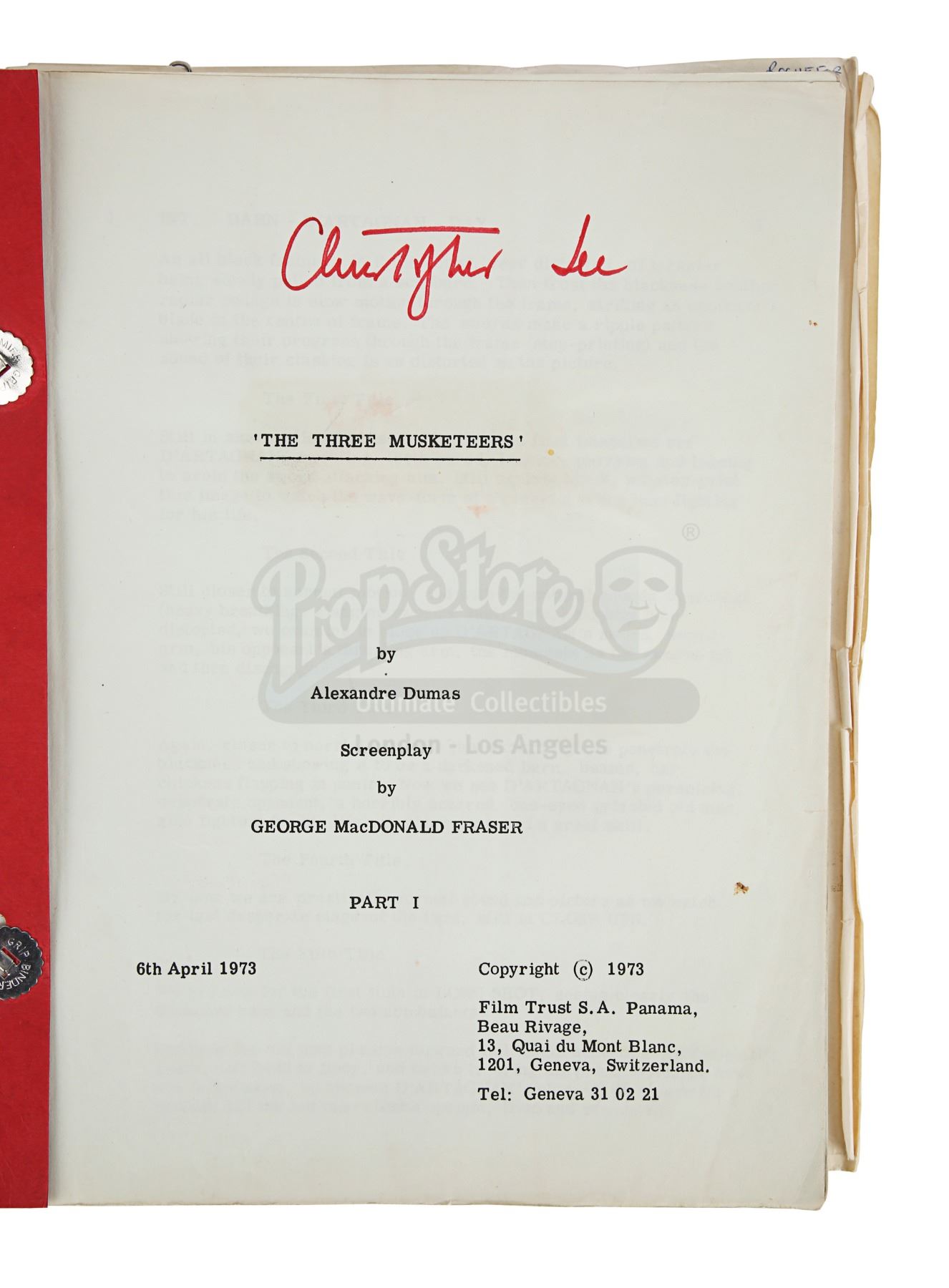 Sir Christopher Lee's personal annotated filming script from Richard Lester's adaptation of Alexandre Dumas' novel The Three Musketeers. This item comes from the personal collection of legendary actor Sir Christopher Lee. Credited to George MacDonald Fraser and dated "6th April 1973", the script is 206 pages long with five additional pages slipped in. It is bound in a red card cover using metal butterfly fasteners. "Christopher Lee" is handwritten by Lee in red pen on the title page and his role of Rochefort is circled throughout. The script has some wear from production use and age, including creases, minor tears and edgewear. Dimensions: 28 cm x 22 cm x 2.5 cm (11" x 8 3/4" X 1")