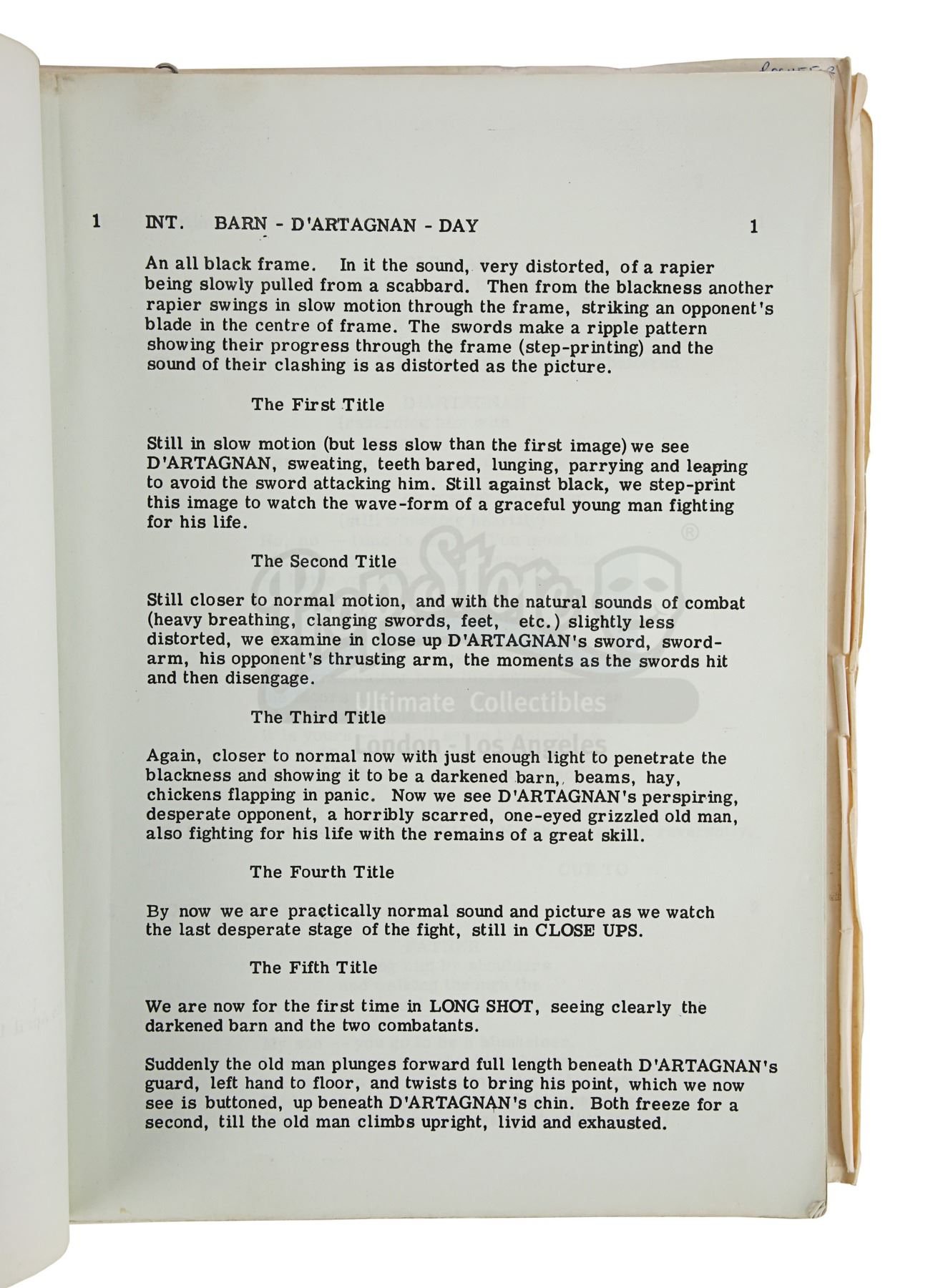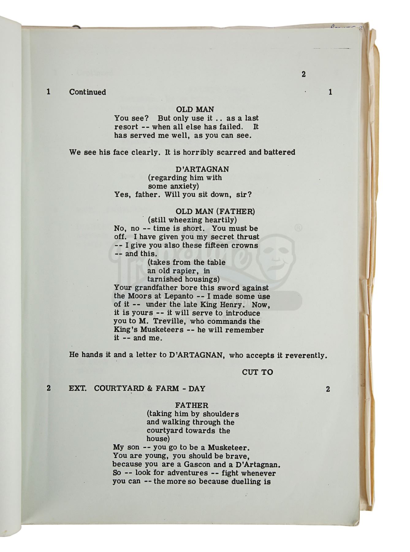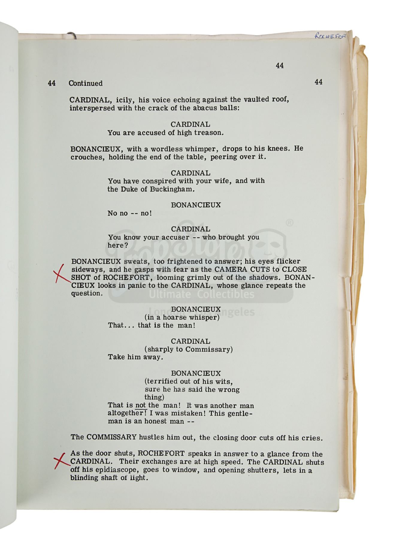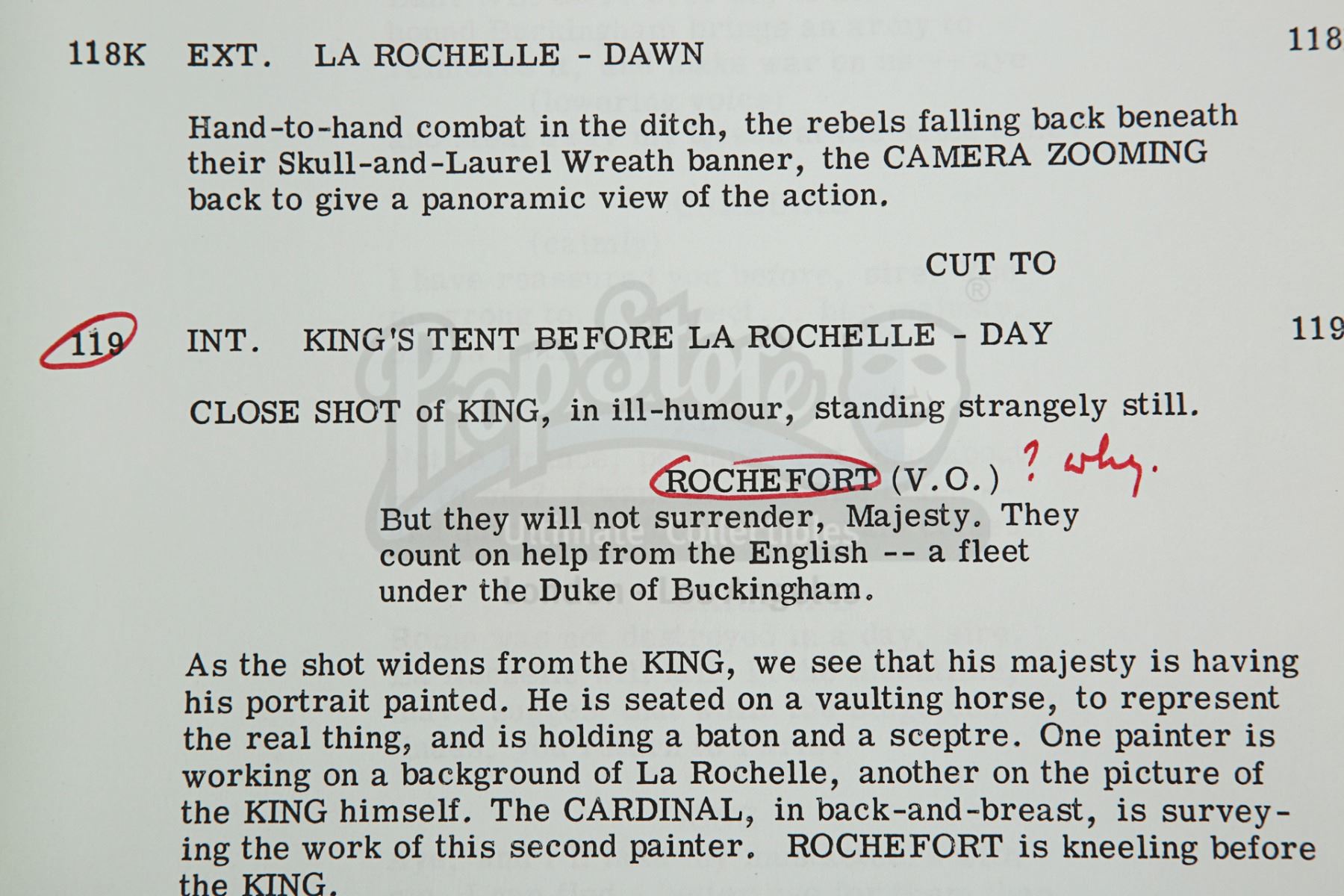 Sir Christopher Lee's personal annotated filming script from Richard Lester's adaptation of Alexandre Dumas' novel The Three Musketeers. This item comes from the personal collection of legendary actor Sir Christopher Lee. Credited to George MacDonald Fraser and dated "6th April 1973", the script is 206 pages long with five additional pages slipped in. It is bound in a red card cover using metal butterfly fasteners. "Christopher Lee" is handwritten by Lee in red pen on the title page and his role of Rochefort is circled throughout. The script has some wear from production use and age, including creases, minor tears and edgewear. Dimensions: 28 cm x 22 cm x 2.5 cm (11" x 8 3/4" X 1")