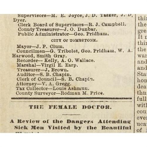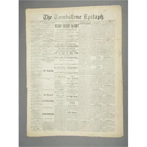 <B>THE TOMBSTONE EPITAPH NEWSPAPER ANNOUNCING THE "KILLING OF BILLY THE KID" 1881</B></I> - Tombstone, Cochise County Arizona. This newspaper pertaining to the Famous Tombstone Arizona Territory. Dated July 20. 1881. Great front page article about the killing of “Bill the Kid” at Fort Sumner by Pat Garrett, Sheriff of Lincoln County. Has Vignette of Stagecoach. “Arizona Mail & Stage Line” News of the day, ads, Etc. <BR><BR><B>Condition: </B></I> Good<BR><BR><b>Shipping:</b> Flat Material, Large (<a target="_blank" href="http://www.heritageauctions.com/common/shipping.php">view shipping information</a>)