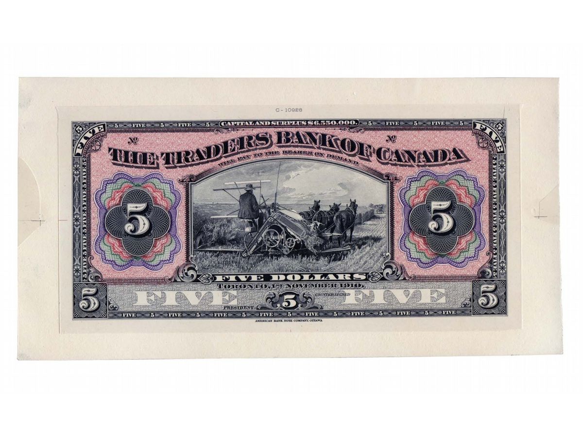 $5.00. Nov. 1, 1910. CH-720-18-02P. A multi-coloured Face Proof on a large card. (4-1/2" x 9"). C-10928 at top in margin. Unc.