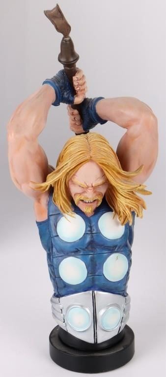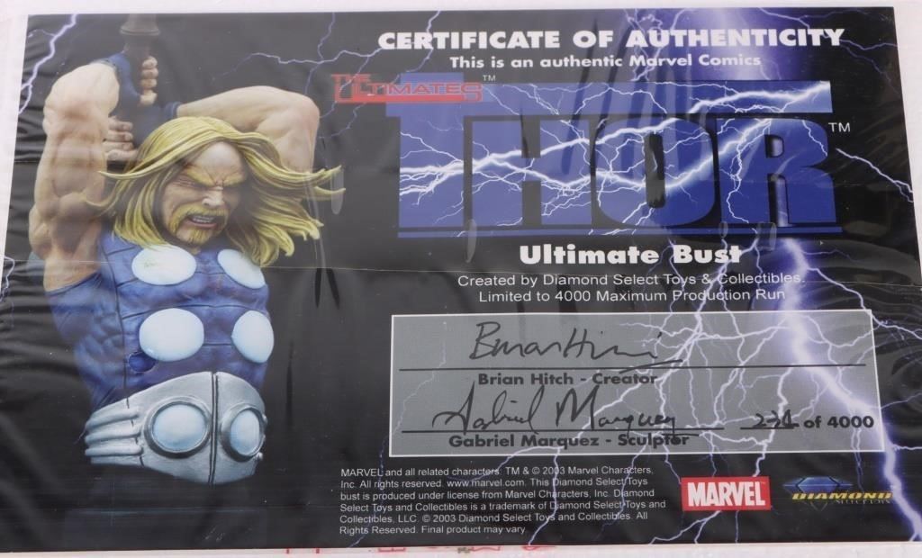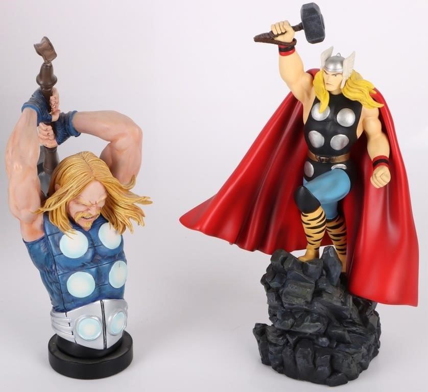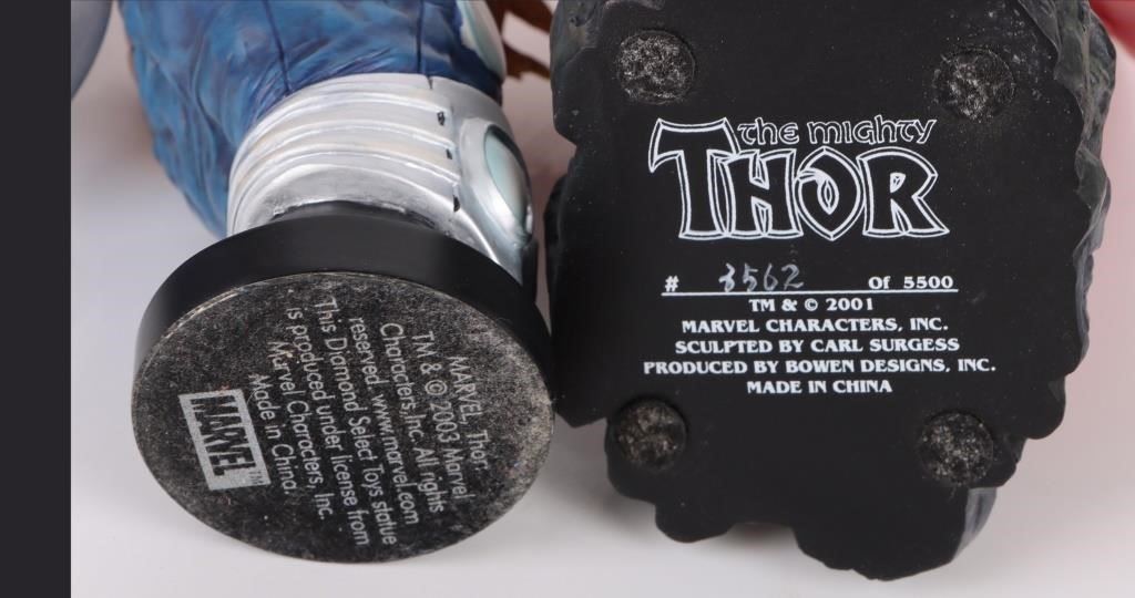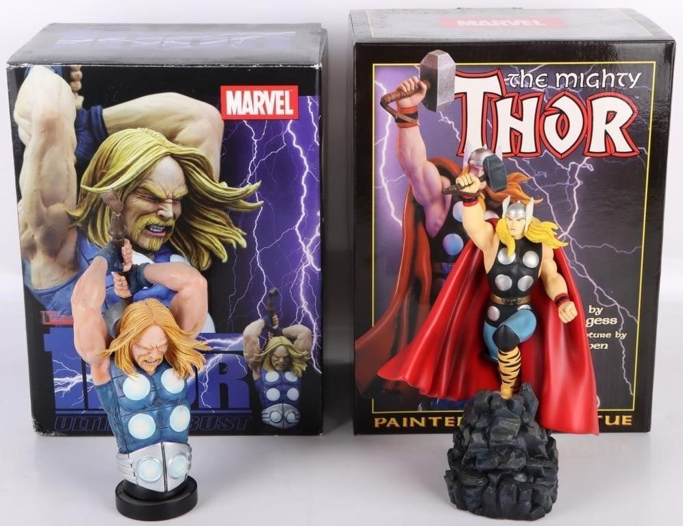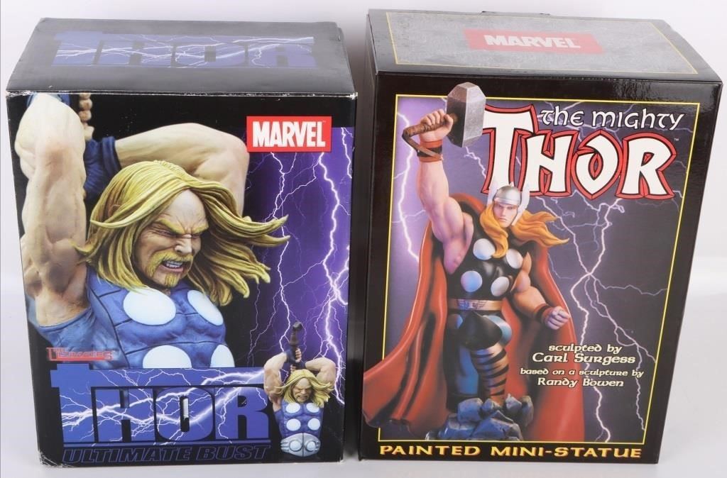 Marvel Thor resin busts to include one The Ultimate Thor Ultimate Bust, and one The Mighty Thor Bowen Designs painted mini statue limited to 3562/5500. Both pieces come with original boxes and papers.