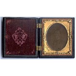 1/9 plate ambrotype of a young man (dark.) The mat has the identification of Prescott & Gage, Artists.