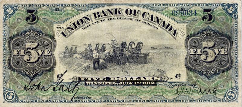 THE UNION BANK OF CANADA. Winnipeg Issue. $5.00. July 1, 1912. CH-730-16-04. No. 099034/C. PMG graded Fine-12.