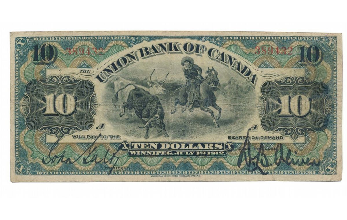 $10.00. July 1, 1912. CH-730-16-08. Winnipeg issue. No. 389432/A. Very Good.