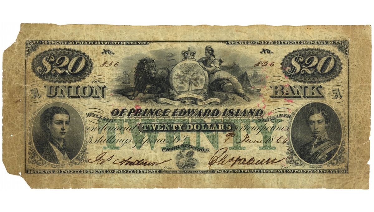 $20.00. June 1, 1864. CH-755-10-08R. No. 856. A Remainder, with spurious/forged date, serial numbers and signatures. PMG graded Choice Fine (Net). "Note unaffected by issues in selvage" Internal Tear. The only known surviving example. The last appearance of the note was the 1986 Kagin's ANA auction sale.