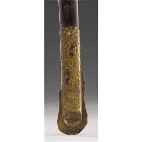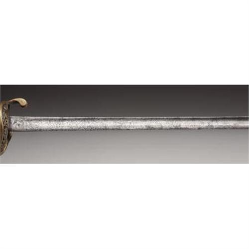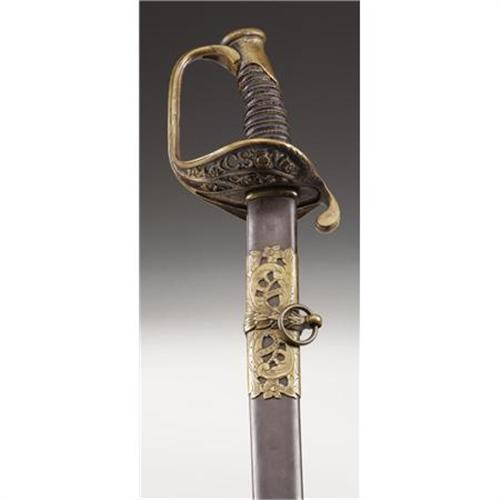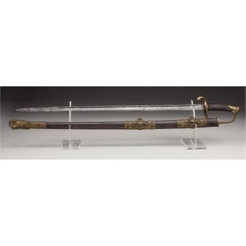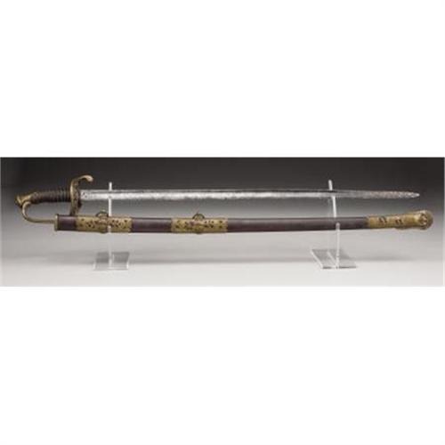 <B>GENERAL POLK'S UNIQUE JAMES CONNING MOBILE, ALABAMA CONFEDERATE STAFF OFFICER’S SWORD ATTRIBUTED TO LIEUTENANT GENERAL LEONIDAS POLK IN ALBAUGH.</B></I> This is the exact sword pictured in FIG 31-F in Albaugh’s ‘Photo Supplement’. The brass guard exhibits a CS pierced in the basket along with floral and scroll motifs. There is cast decoration on the outside of the guard and on the top of the quillon. The leather wrapped grip utilizes twisted brass wire. The knuckle bow is joined to the pommel with a brass pin and has a slot for the sword knot. The pommel cap is unique in our experience exhibiting hand hammered decoration with a stippled finish. Another unique detail is the silver Christian cross inlaid on the top of the peen. The inside face of the guard is decorated with hundreds of tiny lines with a stippled border, the recessed outer face of the guard has similar decoration. Additionally there are rather crude engraved lines that radiate from the grip and an identical Christian cross is engraved at the back. of the guard where it intersects with the knuckle bow, doubtless harkening back to Polk’s career as an Episcopalian clergyman and bishop. The 30 ½” straight blade has an unstopped fuller which terminates 5” from the tip and 1 1/8” from the guard. The exquisite etching is also unique in our experience. The base of the obverse has a five pointed star on a cross hatched background. Above this is a Confederate shield surmounted by a 2d national Confederate flag and a riband with “Confederate States. There are floral and scroll motifs intertwined throughout with a stand of flags and arms in the center. The reverse has a fan like motif on the same cross hatched background at the base. Above this is a stand of flags including a Confederate battle flag. The balance is covered with floral and scroll motifs with a very intricate old English CS in the center. All etching is profusely highlighted with hand engraved details. There is a cryptic mark of three dots on the obverse of the blade at the base. The iron scabbard, while period, and fitting the sword snugly is, in fact a replacement, the original scabbard as pictured in Albaugh apparently having been lost or destroyed. The scabbard has intricately pierced brass mounts which are extensively chaised and engraved with floral and scroll designs. The ring mounts display a cast laurel leaf and berry motif with brass carrying rings. Leonidas Polk was a North Carolina native and West Pointer who resigned his commission soon after graduation. He immediately took up the cloth and became an Episcopal minister being elevated to Missionary Bishop of the Southwest in 1838 and Bishop of Louisiana in 1841. At the personal urging of Jefferson Davis, Polk joined the Confederate Army and was commissioned a major general on June 25, 1861. His early service was with the Army of the Mississippi. He was commissioned a lieutenant general October 10, 1862, commanding a corps in the Army of Tennessee. Polk was engaged at Shiloh, Murfreesboro, Chickamauga, the Tullahoma Campaign and the Atlanta Campaign He was killed when struck by an artillery round at Pine Mountain on June 14, 1864. While not one of the shining lights of the Confederate high command, Polk was a dedicated, if reluctant, soldier, who gave his life in defense of the South. A unique sword for both its form and famous owner.<BR><BR><B>Condition:</B></I> Brass hilt with nice untouched patina. Grip and wire both tight and excellent. The blade has scattered light pitting with rather heavy pitting on the last 6” toward the tip, otherwise gray. The replacement iron scabbard is black and untouched with the mounts having an untouched patina. The bottom mount has a severe dent at the bottom and the drag is bent. <BR><BR><b>Shipping:</b> Bats, Clubs, Sticks, Swords, Rif (<a target="_blank" href="http://www.heritageauctions.com/common/shipping.php">view shipping information</a>)