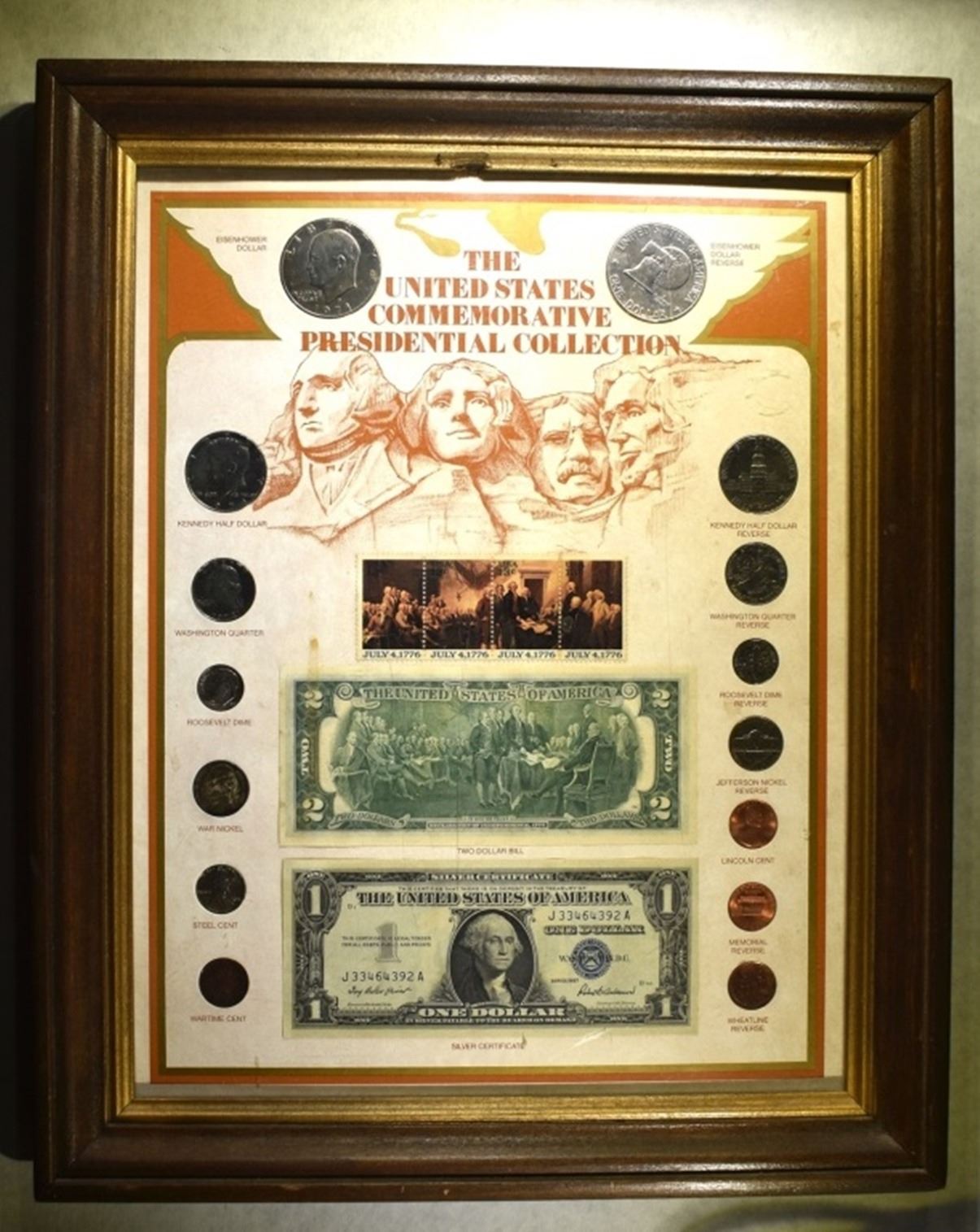 COLLECTION FRAMED approx. 13"x 16" CONTAINS: 4 STAMP SERIES "SIGNING OF DECLARATION" JULY 4, 1776, TWO DOLLAR BILL "SIGNING OF DECLARATION", 1957 $1.00 SILVER CERTIFCATE, 2- EISENHOWER 1971 DOLLARS, 2-