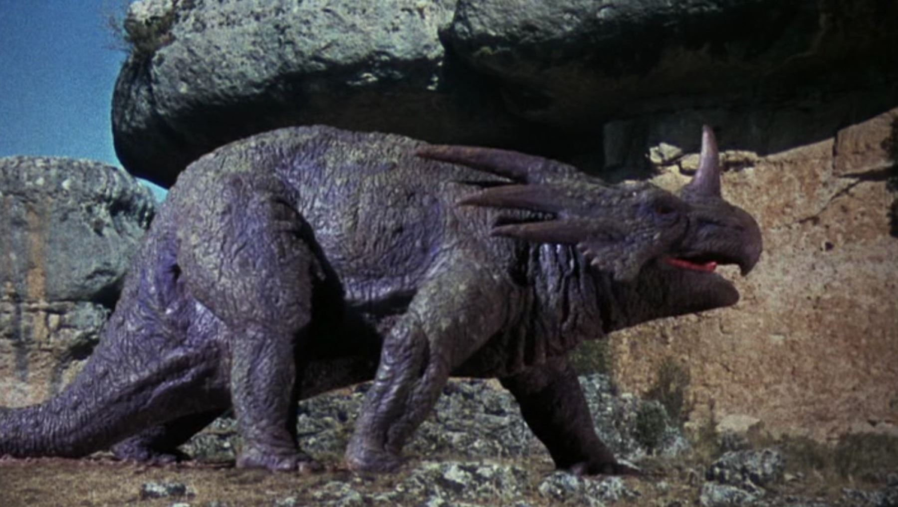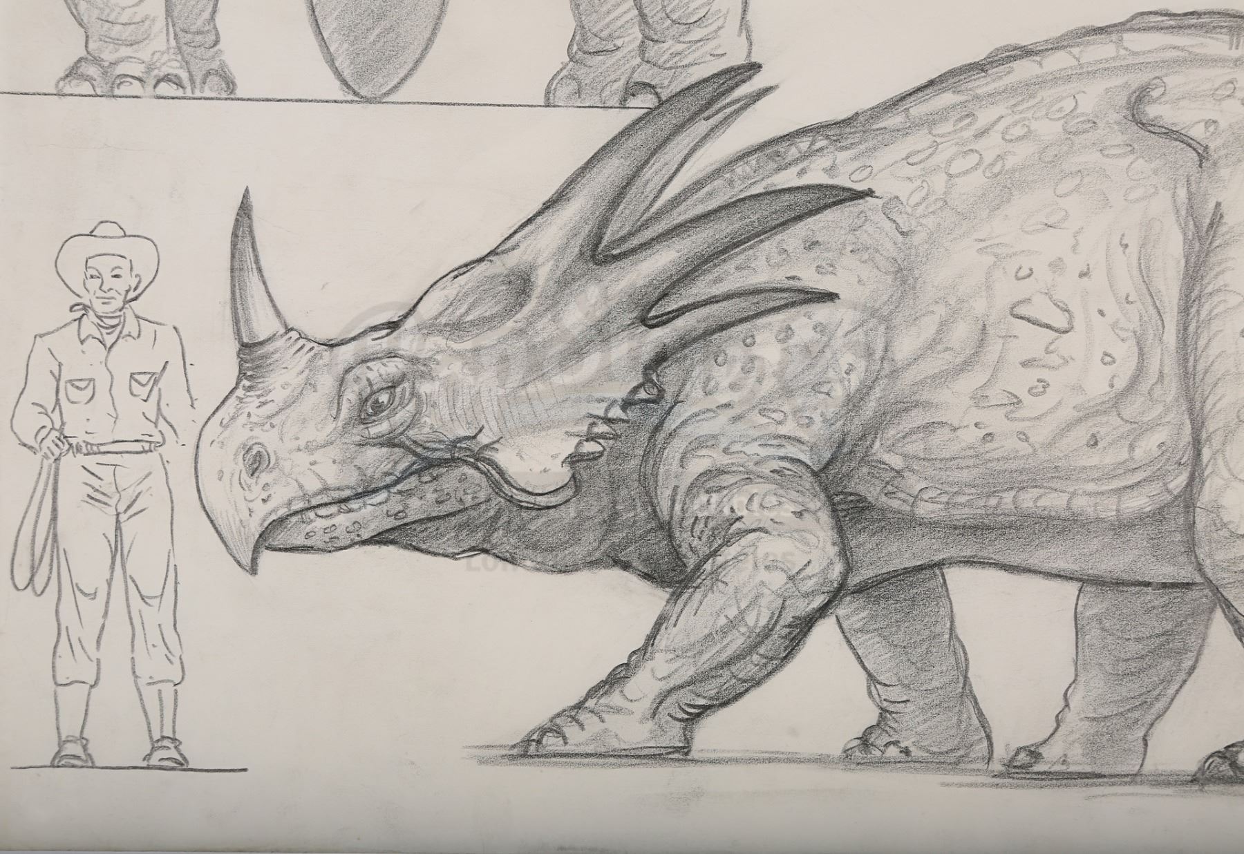 A Ray Harryhausen hand-drawn styracosaurus scale comparison from Jim O'Connolly's Western adventure The Valley of Gwangi. The image shows a styracosaurus face-on and in profile, along with a human for scale. Harryhausen often made detailed size comparisons as a matter of routine, as they were vital for his own reference, as well as that of the actors, to help visualise the true size of his creations.