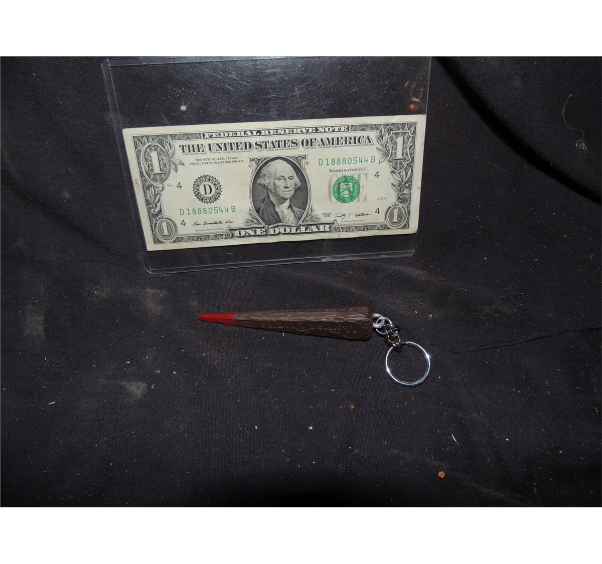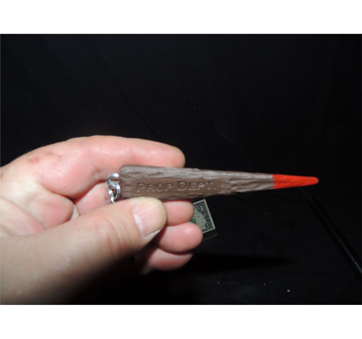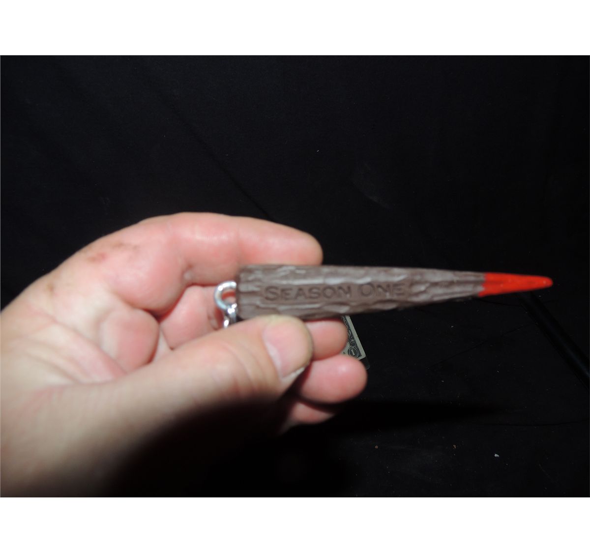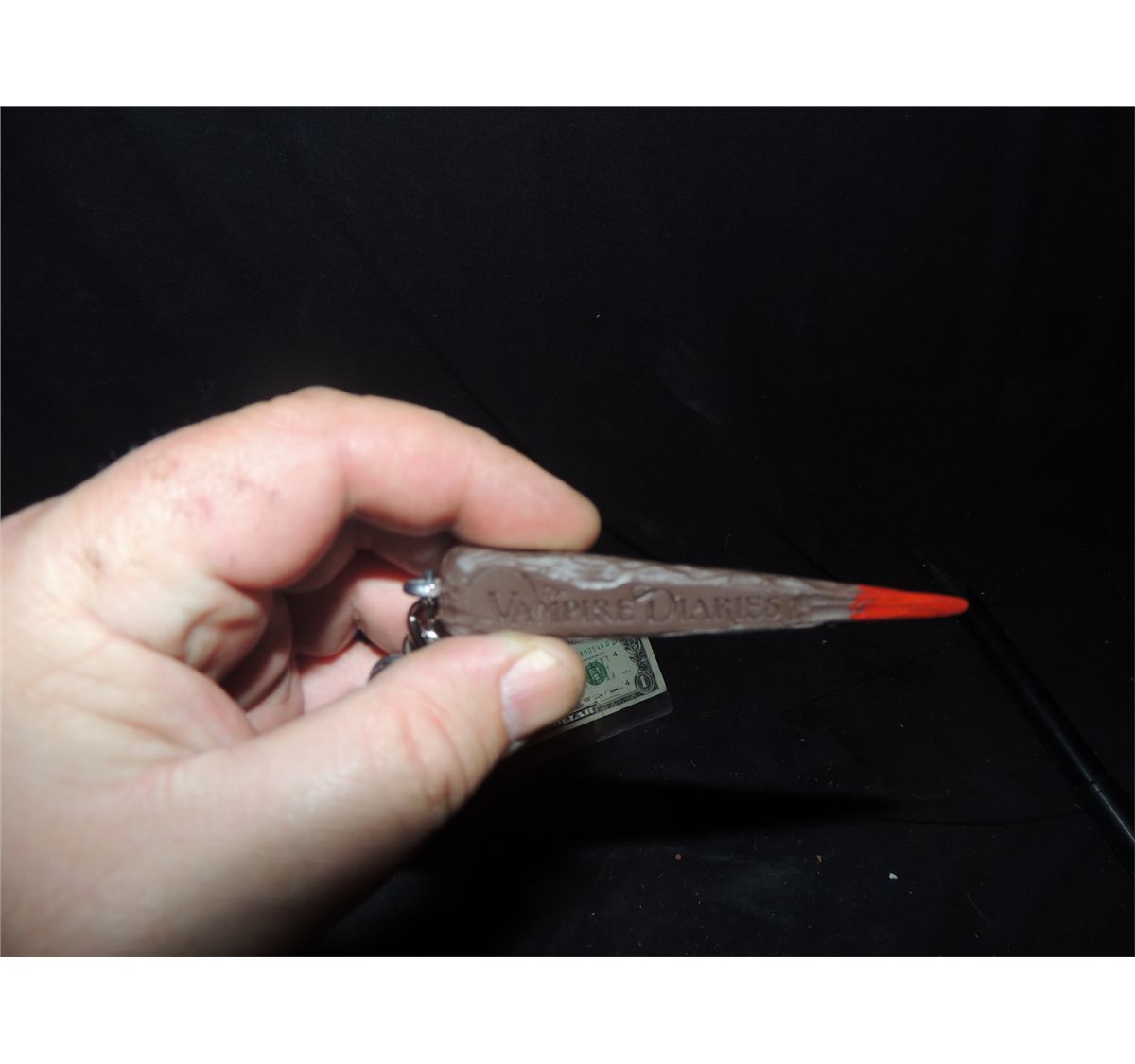 This is a rare season one crew to the prop department head for work on THE VAMPIRE DIARIES. It is a miniature 3 sided bloody stake that says THE VAMPIRE DIARIES on one side, SEASON ONE, on the second, and PROP DEPARTMENT on the third.