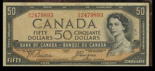 THE VERY LAST NOTE PRINTED. BC-34b 1954 $50 Beattie-Coyne devil's face A/H2479893 VG, small #40 written on face. According to Charlton, this would have been the last note printed of this series. A very unusual and neat note.