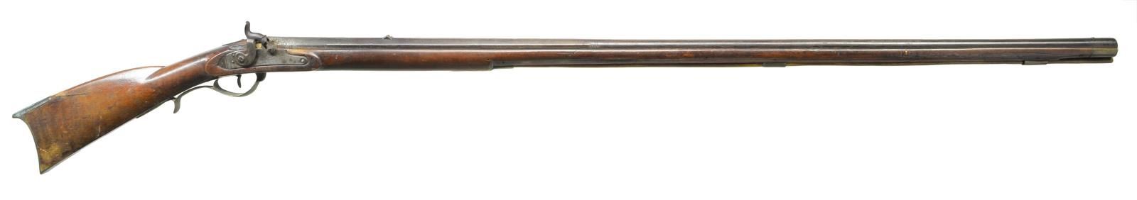 Cal. 65 smooth bore. NSN. Bbl. 44 1/2" oct. to rnd. Percussion lock has been converted from flint. The gun was made using a sideplate & trigger guard from a much earlier gun. Gun is plain & undecorated but is the sort used along the Blue Mountain by settlers just to have a gun around the house. Although not particularly valuable, there are collectors who like to have at least one of these guns in order to show others what the average people used. They are generally harder to find because they were thrown away when they were done being used. CONDITION: everything appears clean & correct the way it was made. PROVENANCE: Collection of Dr. John Persing. (01-19663/RG). ANTIQUE. $1,000-1,500.