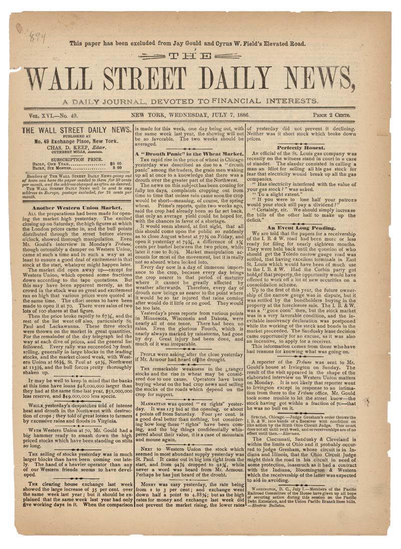 Wall Stree Daily News. New York. Wednesday July 7, 1886."" Four pages, 9 3/4"" x 13 1/2"". First page headlines include: "" Another Western Union Market,"" ""A Drought Panic in the Wheat Market,"" ""Perfectly Honest"" and ""An Event Long Pending."" Overall Fine.