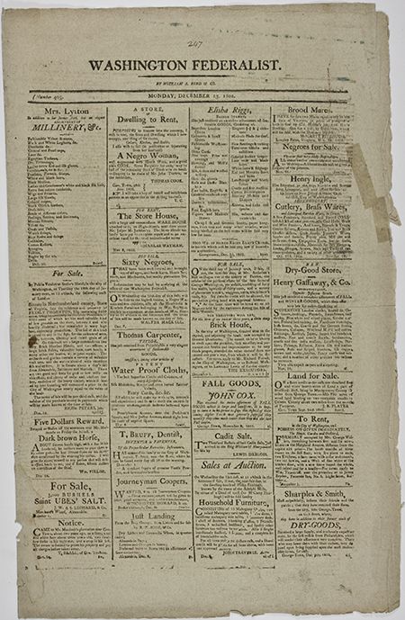 A copy of the Washington Federalist for Monday, Dec. 13, 1802, 4pp. folio. Still reeling from their rout by Jefferson, the Federalist mouthpiece for Washington sarcastically revels in the return of the now notorious Thomas Paine from France. Since Paine's involvement with the Revolution in France, he fell out of favor with American conservatives. The comments, which appear on the third page, read in part: "...Mr. Paine has come over to this country, upon the invitation of our illustrious President, to reach the thousands who have grown up to manhood, since he went away, that the term federalist as nothing to do with the federal constitution, and of course that there never were any such persons as anti-federalists. It would therefore be perfectly federal to make a new constitution a-la-mode de Paris..." Other snippets include: "...It was once the fashion for the monarchs of Europe to have fools or buffoons to make sport for them: Paine unites the two characters of political buffoon and prose-laureate for king Thomas..." Paper also includes foreign news as well as an advertisement for several large tracts of land from the estate of George Washington including lots in the City of Washington, Virginia, Maryland, Pennsylvania, New York, Ohio, and Kentucky. Much more including an account of a corn husking competition gone very wrong. Margins ragged a few tears repaired with tape, otherwise very good.