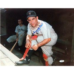 Yogi Berra Signed Kneeling by Equipment Color Vertical 8x10 Photo