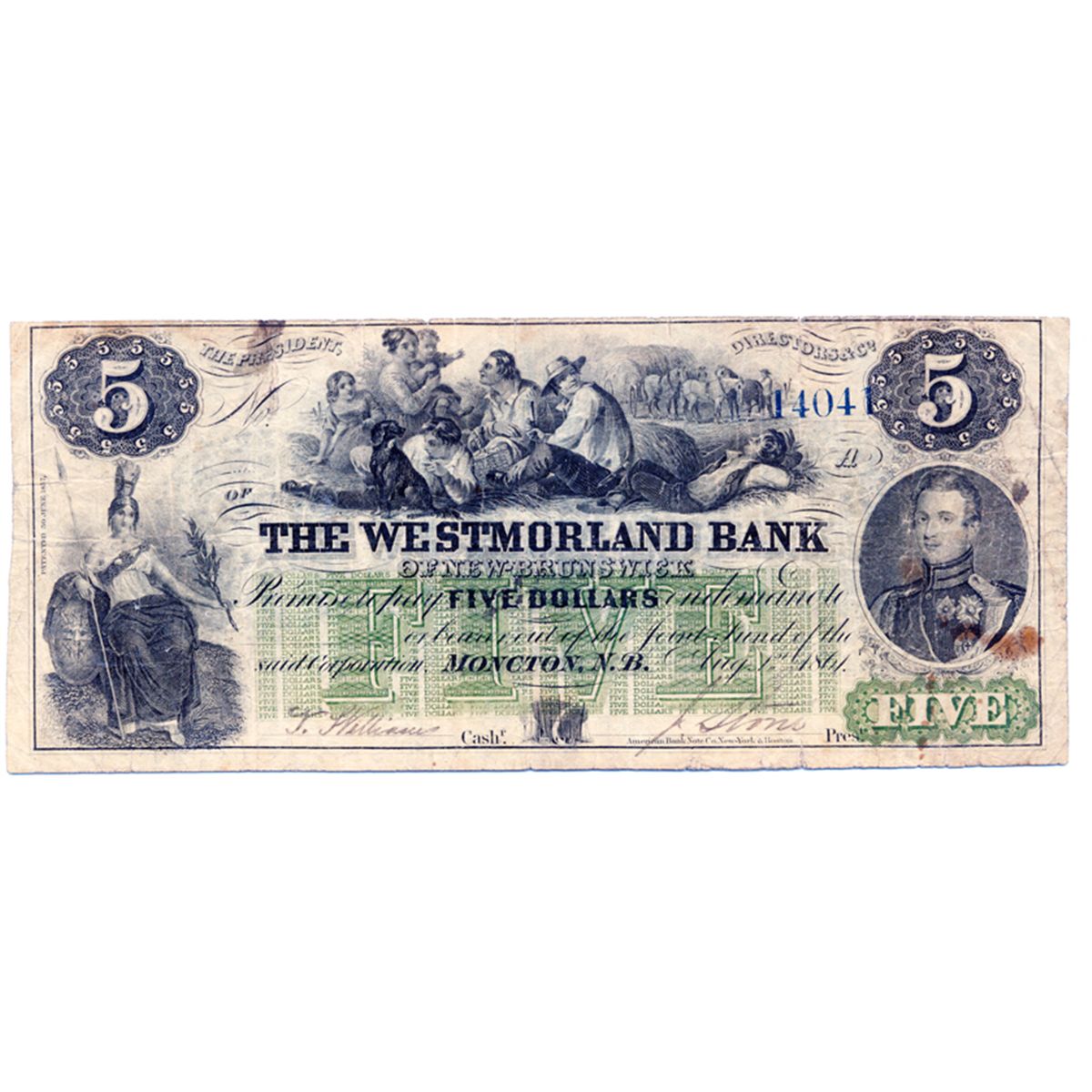 THE WESTMORLAND BANK. $5.00. Aug. 1, 1861. CH-800-12- 06R. No. 1404/A. PMG graded VG-10.