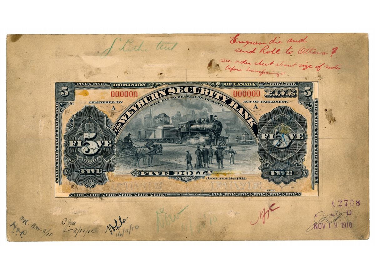 THE WEYBURN SECURITY BANK. $5.00. Jan. 3, 1911 issue. CH-805-10-02MP. Models of the Face and Back on large heavy cards. The Face with serial number 0000000/A and some other elements pasted on. Approval signatures and bank note company notations on the card. Typical banknote company production ink staining. Various ABNC stamps and dates, including "Approved:Nov. 24, 1910".