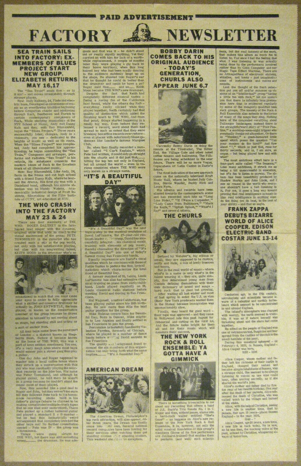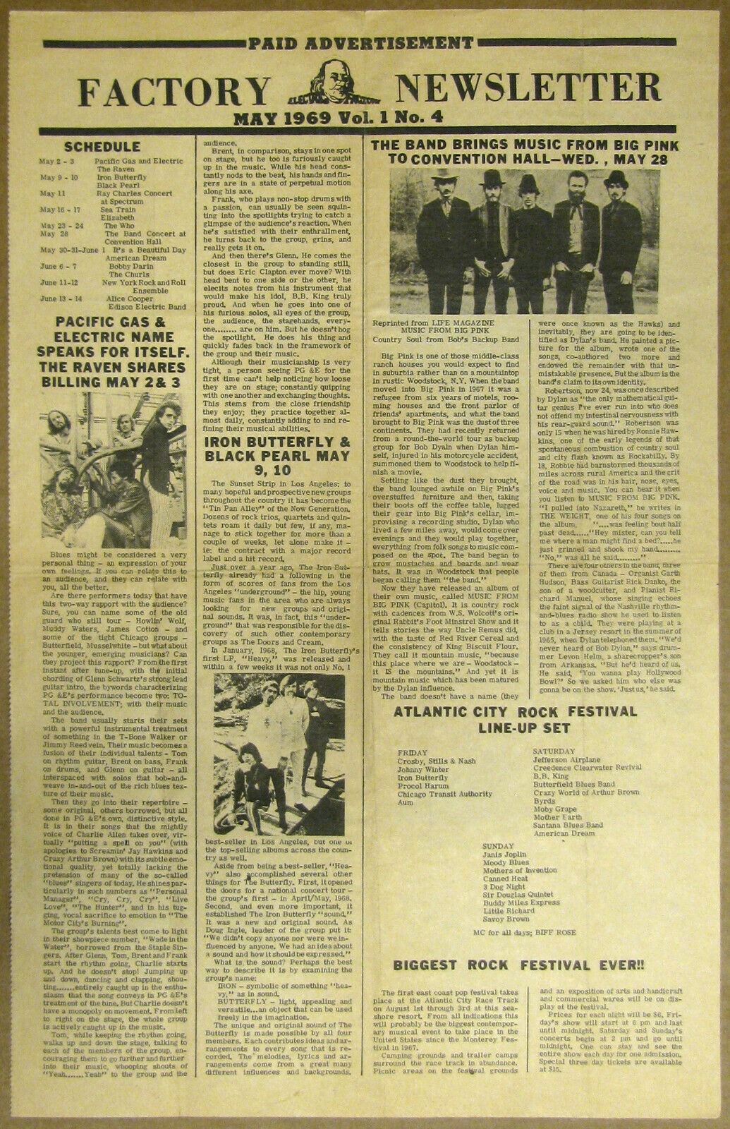 In 1969 The Electric Factory in Philadelphia put out a handful of these, one each month announcing, advertising and promoting their upcoming concerts masquerading as a newspaper-like newsletter.