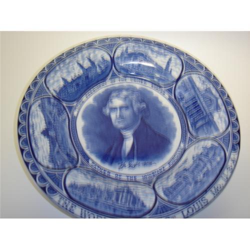 WORLDS FAIR BLUE AND WHITE THIRD PRESIDENT OF THE UNITED STATES,FATEHER OF THE LOUISIANA PURCHASE. THE WORLDS FAIR ST LOUIS MON USA ON BOTTOM THE ROWLANS AND MARSELLUS CO STAFFORDSHIRE ENGLAND. DESIGNED AND IMPORTED YEAR 1904. DOES HAVE IN GREEN FROM DAD AUBERRY ON BOTTOM.
