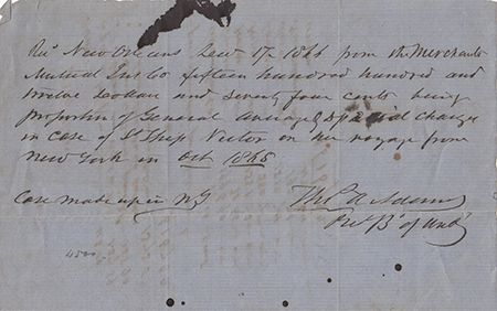 Interesting manuscript D.S. 2pp. oblong 8vo., New York, Dec. 1866, regarding the passage of the steamship Victor which wrecked shortly after this document was penned. It reads: "Rec'd in New Orleans Dec. 17, 1866 [?] from the Merchants Mutual Ins Co fifteen hundred hundred [sic] and twelve dollars and seventy four cents being proportion of General ? charged in case of StShip Victoria on her passage from New York in Oct. 1865...". On verso is a docket titled "Memo" with a list of payees regarding the case. The Victor set sail in October of 1865 from New York bound for New Orleans with a load of merchandise belonging to John Bratt of Staffordshire, England. It wrecked in the Gulf of Mexico under truly terrifying conditions. Bratt describes the horrifying scene in his memoir "Trails of Yesterday" (excerpt included). The Victor was eventually rescued by the merchant ship Alabama transporting cotton from New Orleans to New York, and Bratt remained there having lost everything. Having survived the ordeal but penniless and unemployed, Bratt repaired to New Orleans and eked out a living on the levee in Morganzie. He eventually settled in Nebraska. Light showthrough from verso, otherwise very good condition, worthy of further research.