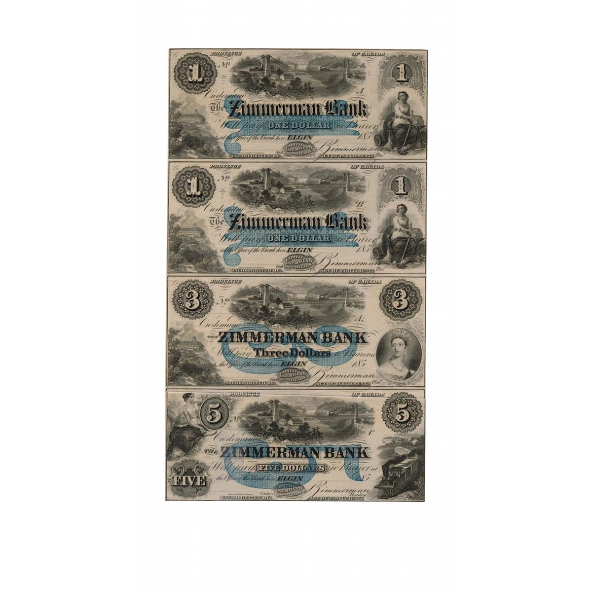 THE ZIMMERMAN BANK. $1.00, $1.00, $3.00, $5.00. 185-(1854-59). CH-815-12-08-02R, 02R, 04R, 06R. An u