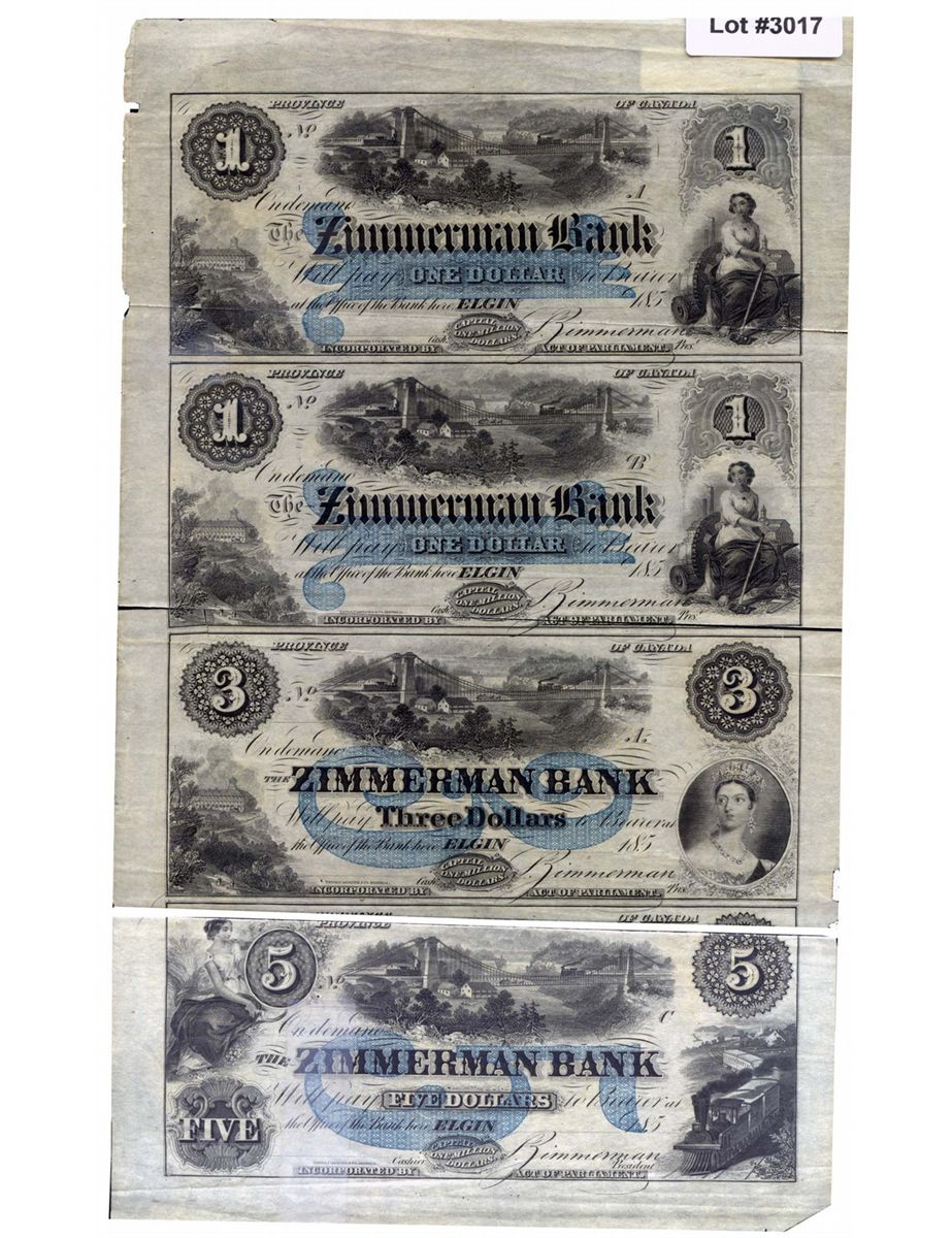 1856 Issue. A Remainder Sheet. $1, $1, $2, $5. CH-815-12-08-02R, 02R, 04R, 06R. Blue 'Numeral' Protector on Face and Back. Large margins. Folds between notes in margins. The bottom note is detached, otherwise the sheet grades an overall Extra Fine.