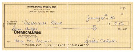 (1920 - 1982) American jazz pianist, a creator of "bop" style, played in bands with Lucky Millander, Coleman Hawkins, and Charlie Parker, composer of "Round Midnight" and "Straight No Chaser". Excessively rare D.S., a business check issued by the Hometown Music Company, New York, Jan. 25, 1980 making a $7.56 payment to Monk and boldly endorsed in blue ink on verso: "T. Monk". The Hometown Music Company was owned by Sid Prosen, a discoverer of Hank Williams and Simon and Garfunkel, and Prosen was a major East Coast jazz promoter. Light soiling, very good.