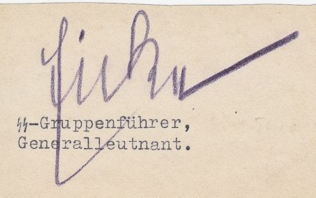 (1892 - 1943) Infamous commander of Dachau, Eicke encouraged his concentration camp staff to live up to their death's head symbol and treat Dachau's prisoners with "inflexible harshness", fittingly killed on the Eastern Front. His signature in grease pencil above his typed rank removed from a document. Fine.