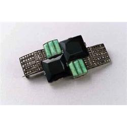 THEODOR FAHRNER, Pforzheim Brosche, Silber, Markasit, Amazonit, schwarzer Onyx. Im Zentrum zwei facettiert geschliffene quadratische Onyxsteine, versetzt dazu zwei quadratische Felder mit dreifachen Amazonitstegen, seitlich eingefasst von rechteckigen Feldern, diese mit reihenartigem Markasitbesatz. 6 x 4 cm. Bez.: Firmenmarke und Feingehaltsmarke 935. Um 1928 Lit.: Leonhardt,B., Zühlsdorff, D., TH. Fahrner, Schmuck zwischen Avantgarde und Tradition, Stuttgart 1990, Abb. S. 194 (zum Vergleich)