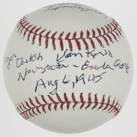 (b. 1921) American Army Air Corps officer, navigator of the Enola Gay during its mission to Hiroshima on August 6, 1945. Fine signed baseball, a Rawlings official major league ball, boldly signed in the sweet spot: "Dutch Van Kirk Navigator - Enola Gay Aug. 6, 1945", with an additional note on another panel: "Last Crewmember from Enola Gay and Bocks Car". Very fine.