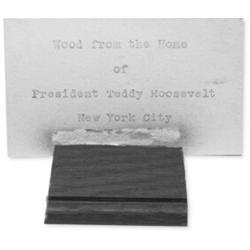 (THEODORE ROOSEVELT): (1858 - 1919) Twenty-sixth President of the United States who started the Panama Canal, settled the Russo-Japanese War, broke up Standard Oil and encouraged conservation. Presidential relic from the home of Roosevelt consisting of a piece of wood molding measuring 1 3/4" x 1 1/4" bearing a typed tag reading: "Wood from the Home of President Teddy Roosevelt, New York City". Acquired from the collection of a privately owned New York State museum assembled during the 1930's. Overall very good. $200-300