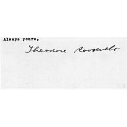THEODORE ROOSEVELT: (1858 - 1919) Twenty-sixth President of the United States who started the Panama Canal, settled the Russo-Japanese War, broke up Standard Oil and encouraged conservation. Fine, bold full signature cut from a letter. Ample margins for matting, fine. $100-150