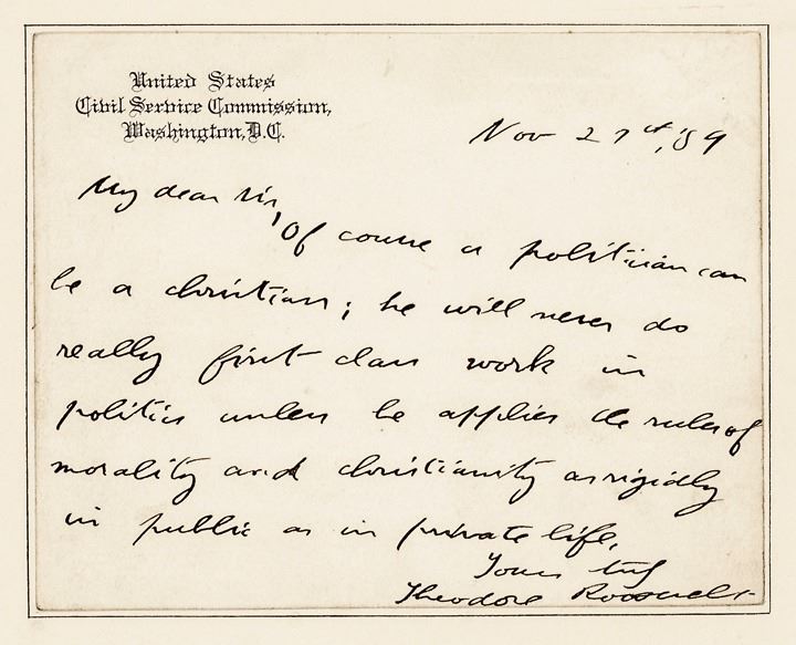 "My dear Sir, -- Of course a politician can be a Christian; he will never do really first class work in politics unless he applies the rules of morality and Christianity as rigidly in public as in private life. - Yours truly, - (Signed) Theodore Roosevelt."