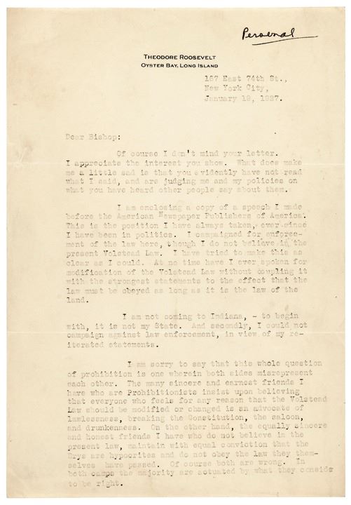 January 19, 1927-Dated Typed Letter Signed, "Theodore Roosevelt," marked "Personal," 2 pages, measuring 7.25" x 10.5", to Bishop Frederick Deland Leete (1866-1958) offering his opinions on Prohibition, Choice Extremely Fine. Theodore Roosevelt writes, in part: