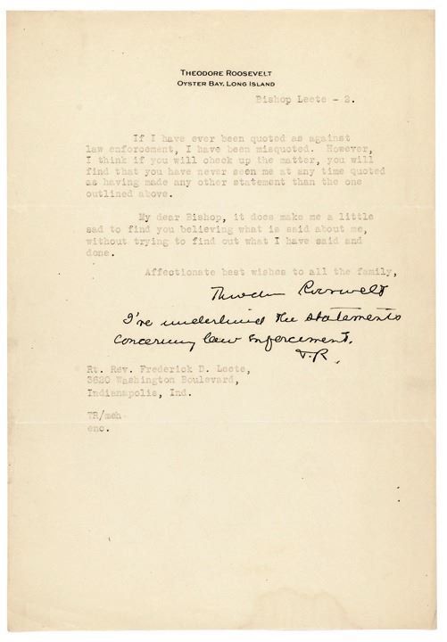 In a Postscript, Roosevelt has also added his vivid brown ink Handwritten notation, in full: "I've underlined the statements concerning law enforcement. -- T. R." (2 items).