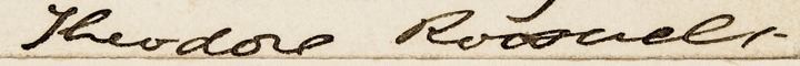 "I am sorry to say that this whole question of prohibition is one wherein both sides misrepresent each other. The many sincere and earnest friends I have who are Prohibitionists insist upon believing that everyone who feels for any reason that the Volstead Law should be modified or changed is an advocate of lawlessness, breaking the Constitution, the saloon, and drunkenness. On the other hand, the equally sincere and honest friends I have who do not believe in the present law, maintain with equal conviction that the Drys are hypocrites and do not obey the law they themselves have passed... (Signed) Theodore Roosevelt". The signature at the conclusion of the main Letter’s text, written in vivid deep brown ink and measuring a large 3” long.