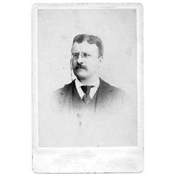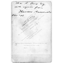 <b>229. THEODORE ROOSEVELT</b> (1858 - 1919) Twenty-sixth President of the United States who started the Panama Canal, settled the Russo-Japanese War, broke up Standard Oil and encouraged conservation. Excellent I.S.P. 4 1/4" x 6 1/2" b/w, a fine chest, up portrait of Roosevelt as N.Y.C. Police Commissioner, inscribed and signed on verso: "<i>Chas. R. Price Esq. with regards from Theodore Roosevelt Nov `95</i>". Light soiling and toning, boldly signed, overall very good.<b> $700-900</b>