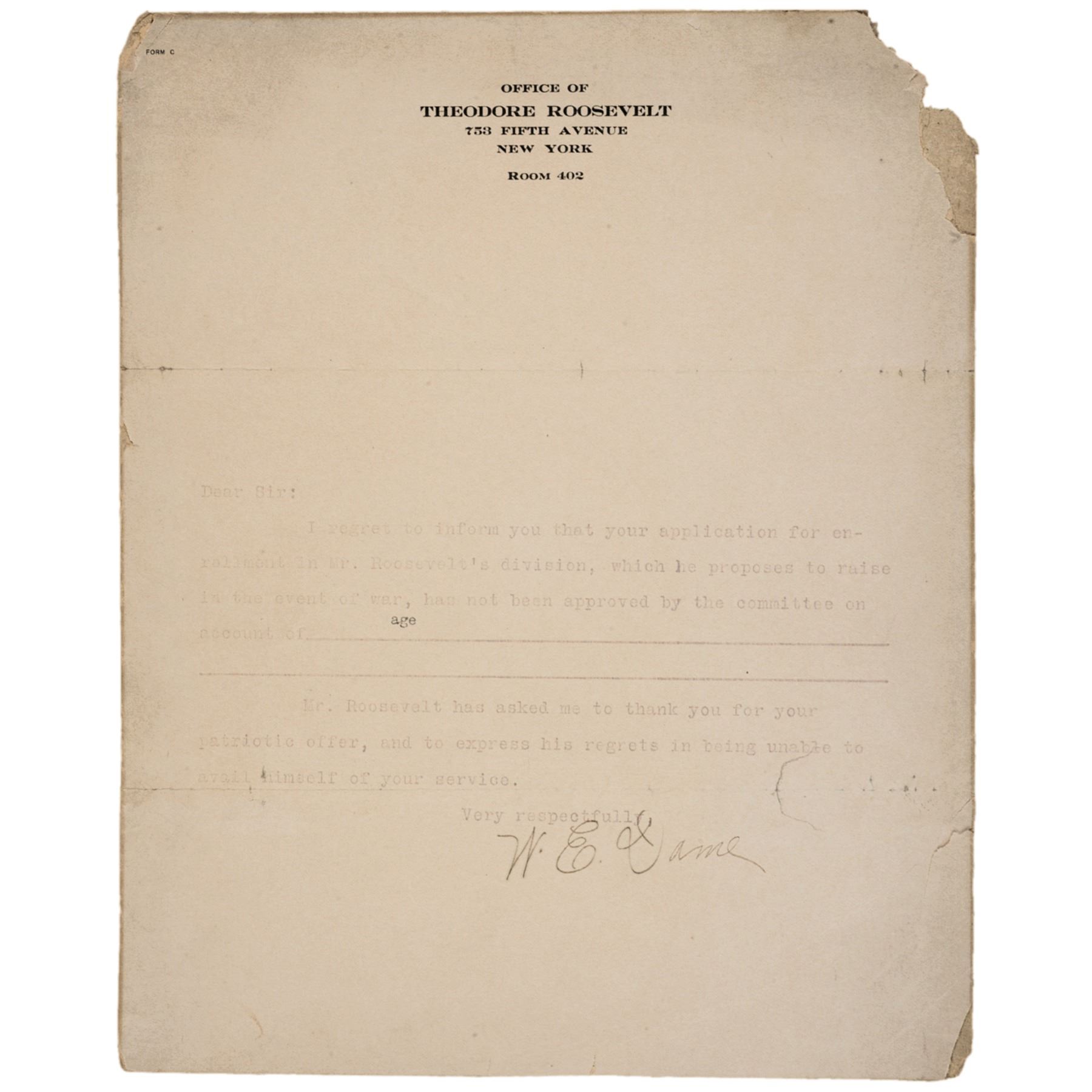 Dear Sir: - I regret to inform you that your application for enrollment in Mr. Roosevelt’s division, which he proposes to raise in the event of war, has not been approved by the committee on account of - age - Mr. Roosevelt has asked me to thank you for your patriotic offer, and to express his regrets in being unable to avail himself of your service. - Very respectfully, - W. E. Dame.”