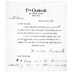 <b>235. THEODORE ROOSEVELT</b> T.L.S. with holograph postscript as Editor of The Outlook on his official letterhead, 1p. 8vo., New York, Dec. 23, 1912, to Mr. Stone, in part: "<i>...I shall read that beautifully gotten up article of yours with the utmost interest...I shall look forward to seeing you the first time you are in New York...</i>[in holograph]<i>: I have read it; it's now more interesting than its appearance warranted!</i>". Slight soiling and smearing to ink, with several holograph emendations in text, overall very good.<b>$350-450</b>