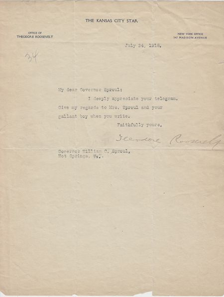 (1858 - 1919) Twenty-sixth President of the United States who started the Panama Canal, settled the Russo-Japanese War, broke up Standard Oil and encouraged conservation. T.L.S. on letterhead of The Kansas City Star, 1p. 4to., New York, July 24, 1918, to Pennsylvania Governor William C. Sproul, thanking him for a telegram. Wear at edges and light toning thereon, else very good condition.