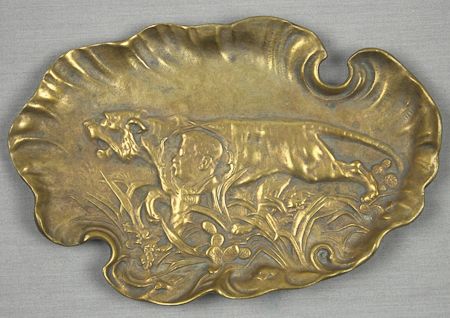 A wonderful piece of Theodore Roosevelt campaign memorabilia, a solid brass ashtray, 6 1/2" in length bearing a bas-relief image of a tiger moving through the grass with a profile portrait of Roosevelt placed on the tiger's side. The ashtray shows only light wear and is in overall fine condition.