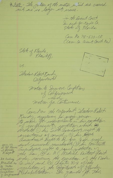 (1946 - 1989) American serial killer who left up to 28 women dead across the states of Washington, Utah, Colorado, and finally Florida where he was convicted of double murder in the notorious "Chi Omega" sorority murders. Despite having twice escaped jail, Bundy was finally unable to escape conviction and the Florida electric chair. A.D.S. "Theodore Robert Bundy" three times, 6pp. on canary legal paper, [prison, ca. June, 1979], a motion made by Bundy during his murder trial in which he notoriously represented himself. Bundy makes a "Motion to Improve Conditions of Confinement and Motion for Continuance", citing the withholding of assistance of legal counsel, affliction of cruel and unusual punishment, lack of access to his legal files, writing materials, a Bible and dictionary, letters, pens, typewriter, etc. He also complains of his small cell, inadequate lighting, the fact that his built-in writing desk will not accommodate his left-handedness, and other disadvantages prohibiting him from preparing an adequate defense. With court receiving stamp affixed to first page. Fine condition. Surprisingly Bundy did a fairly competent job of defending himself...right up until the moment of his electrocution.