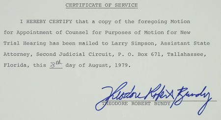 (1946 - 1989) American serial killer who left up to 28 women dead across the states of Washington, Utah, Colorado, and finally Florida where he was convicted of double murder in the notorious "Chi Omega" sorority murders. Despite having twice escaped jail, Bundy was finally unable to escape conviction and the Florida electric chair. Typed D.S., 1p. 4to., [Tallahassee, Aug. 8, 1979], a certification that he had filed suit for a new trial hearing, boldly signed in full at bottom. Fine.
