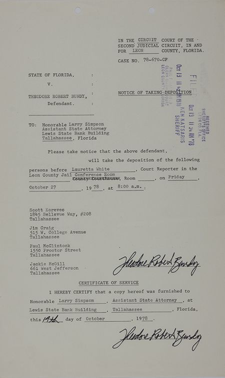 (1946 - 1989) American serial killer who left up to 28 women dead across the states of Washington, Utah, Colorado, and finally Florida where he was convicted of double murder in the notorious "Chi Omega" sorority murders. Despite having twice escaped jail, Bundy was finally unable to escape conviction and the Florida electric chair. Typed D.S. "Theodore Robert Bundy" signed twice, 1p. legal folio, Leon Co., Fl., Oct. 19, 1978, notice to the Asst. State Attorney that Bundy would take the depositions of Scott Kerovec, Jim Craig, Paul McClintock and Jackie McGill, Chi Omega sorority president who was one of the first on the scene of the sorority house murders. File holes at top, else fine.