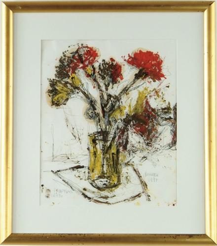 THERESEA FERBER BERNSTEIN (American, 1890-2002) "CARNATIONS". Mixed media on paper still life shows vase of yellow and red carnations. Pen title on left corner and pencil signed and dated in the right corner. Housed in a gilt wood frame with white matte. SIGHT SIZE: 16in. x 13in.. CONDITION: Very good. 9-25015